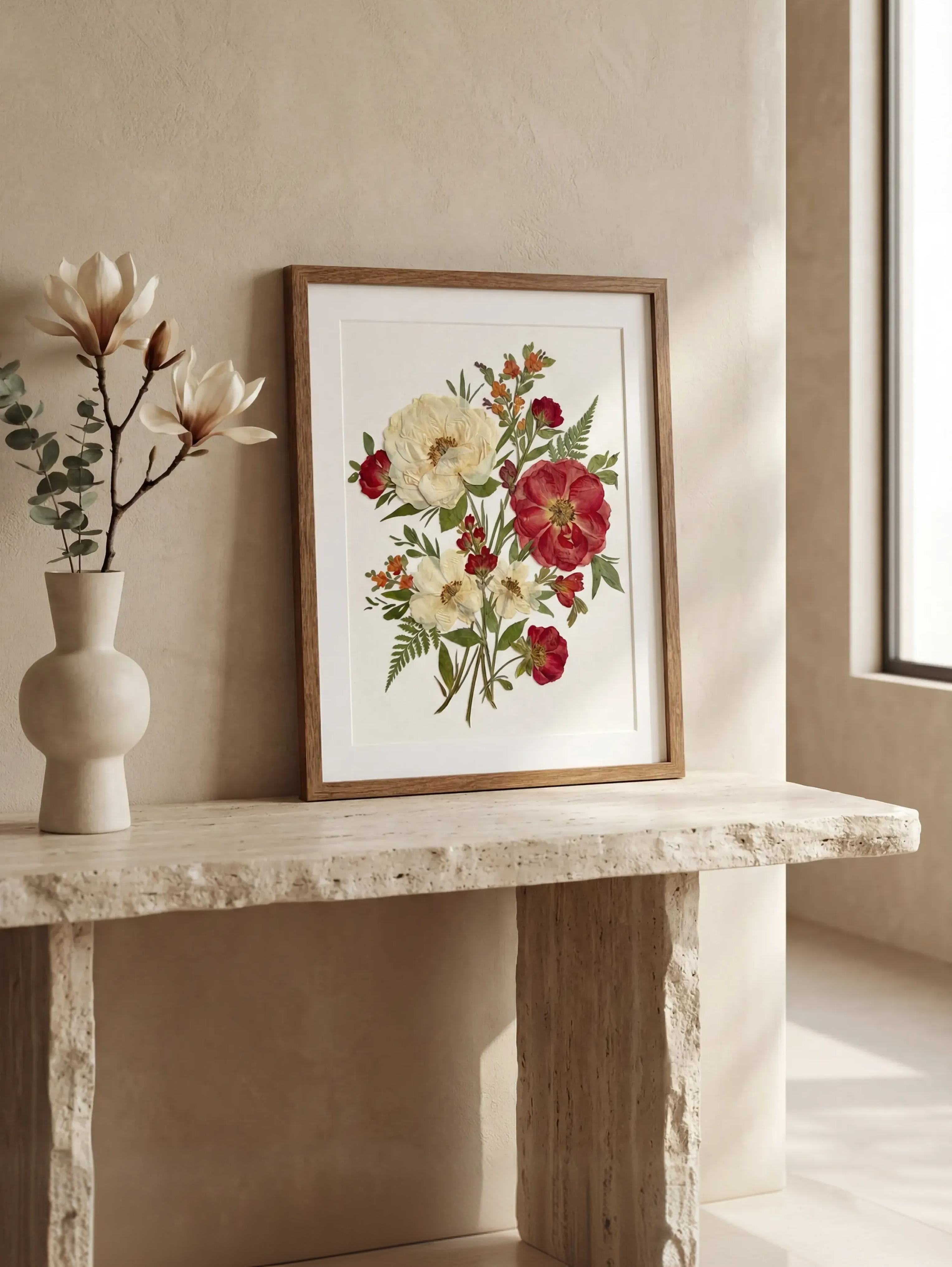 Jedes einzelne Pflanzenelement wird sorgfältig ausgewählt, getrocknet und in unserem Studio konserviert, um dauerhafte Schönheit und Farbe zu gewährleisten.