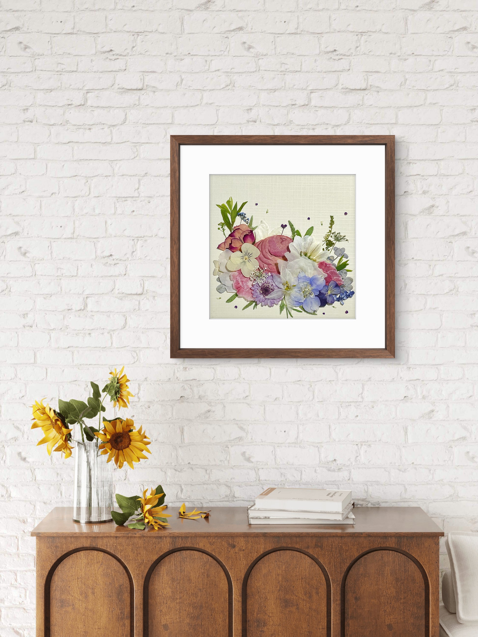 Das Kunstwerk ist mit einer transparenten Acrylplatte abgedeckt und mit einer Aluminiumrückwand versiegelt, um seine Langlebigkeit zu erhöhen und seine botanische Schönheit zu bewahren.