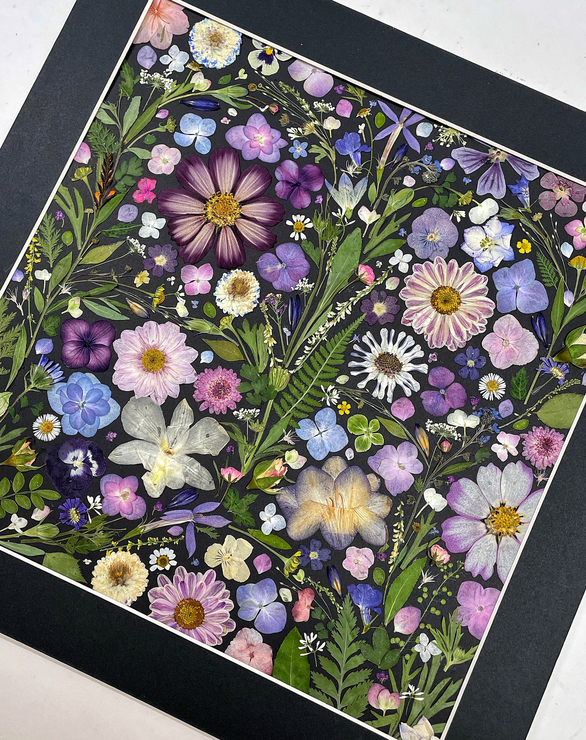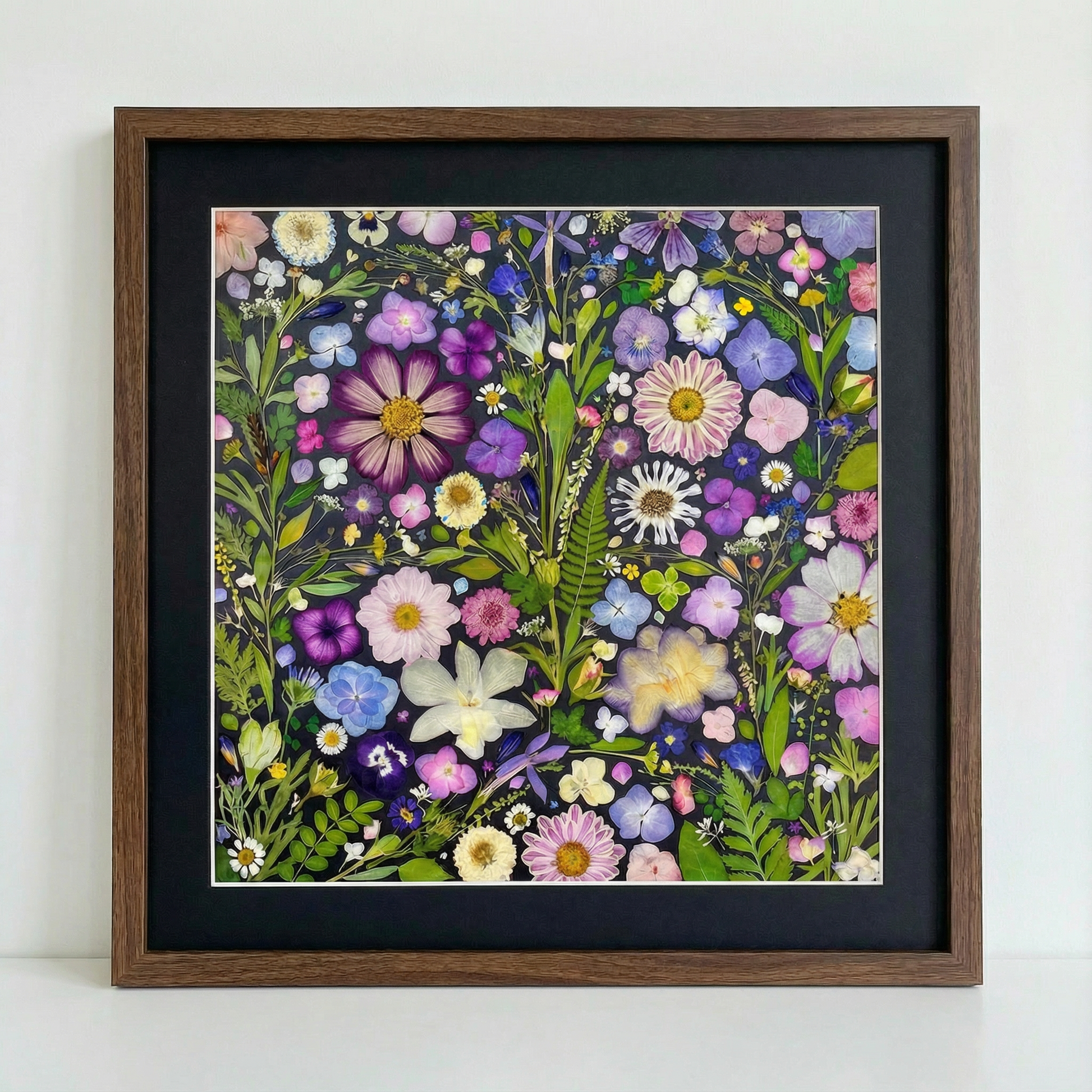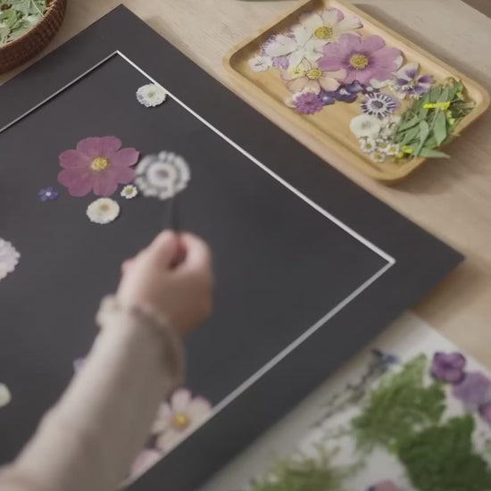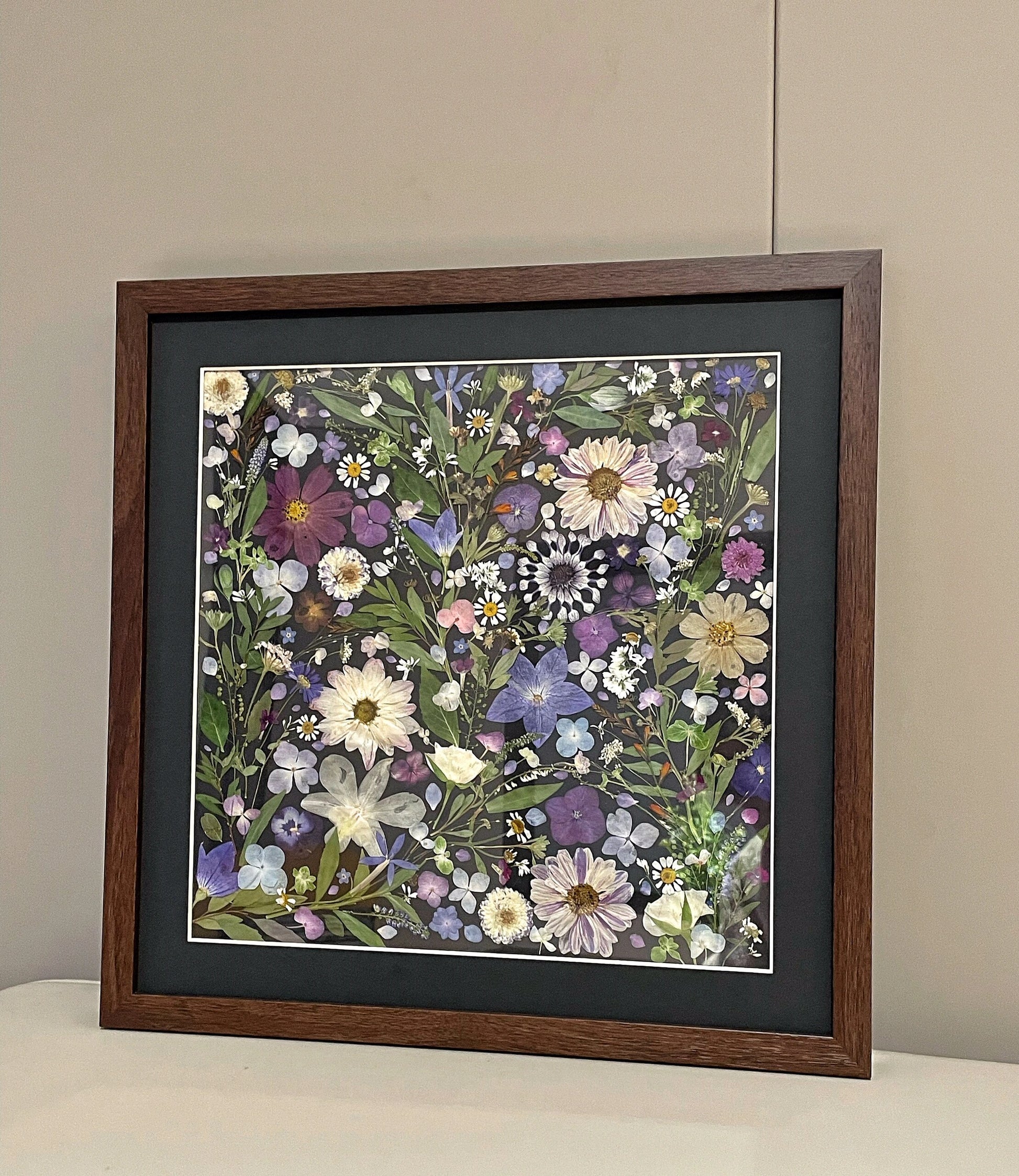 Unsere Floristin arrangiert und klebt sorgfältig getrocknete Blütenblätter auf Hintergrundpapier und kreiert so ein einzigartiges Design. Jedes Blütenblatt stammt von den schönsten saisonalen Blüten, die von unseren erfahrenen Floristen mit größter Sorgfalt ausgewählt wurden.
