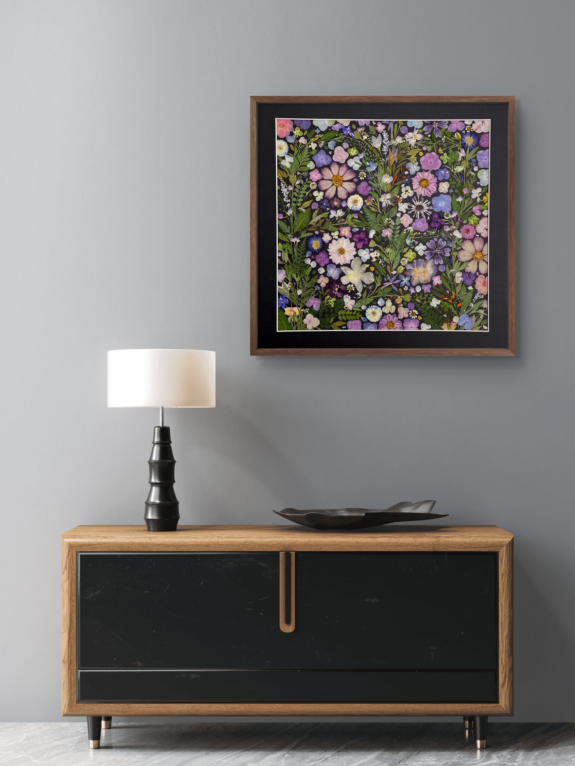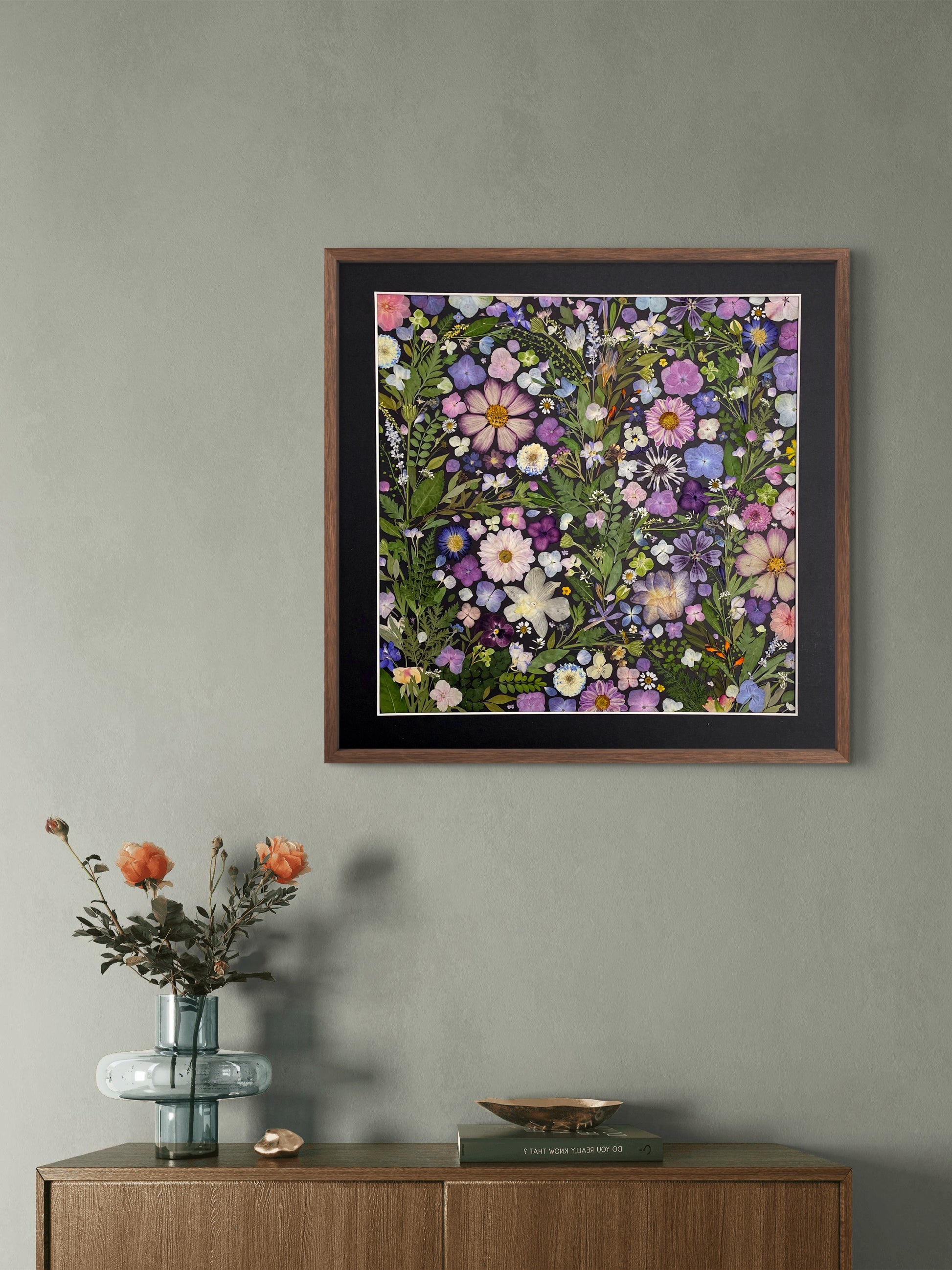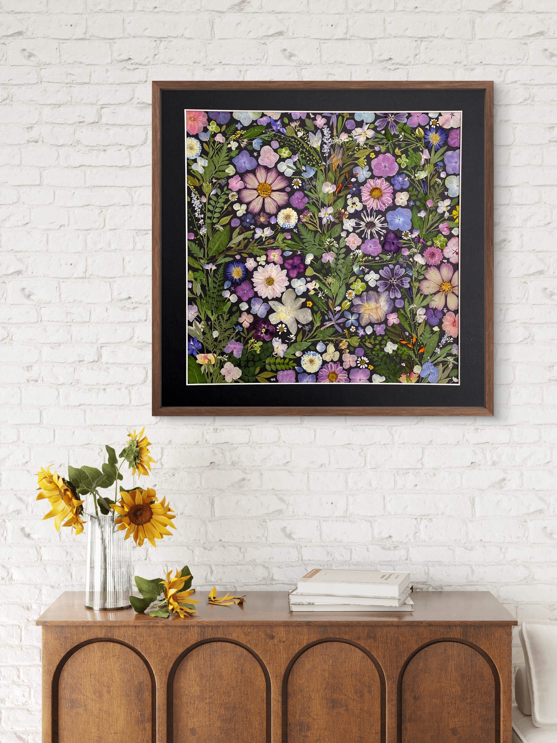 Das Kunstwerk ist mit einer transparenten Acrylplatte abgedeckt und mit einer Aluminiumrückwand versiegelt, um seine Langlebigkeit zu erhöhen und seine botanische Schönheit zu bewahren.