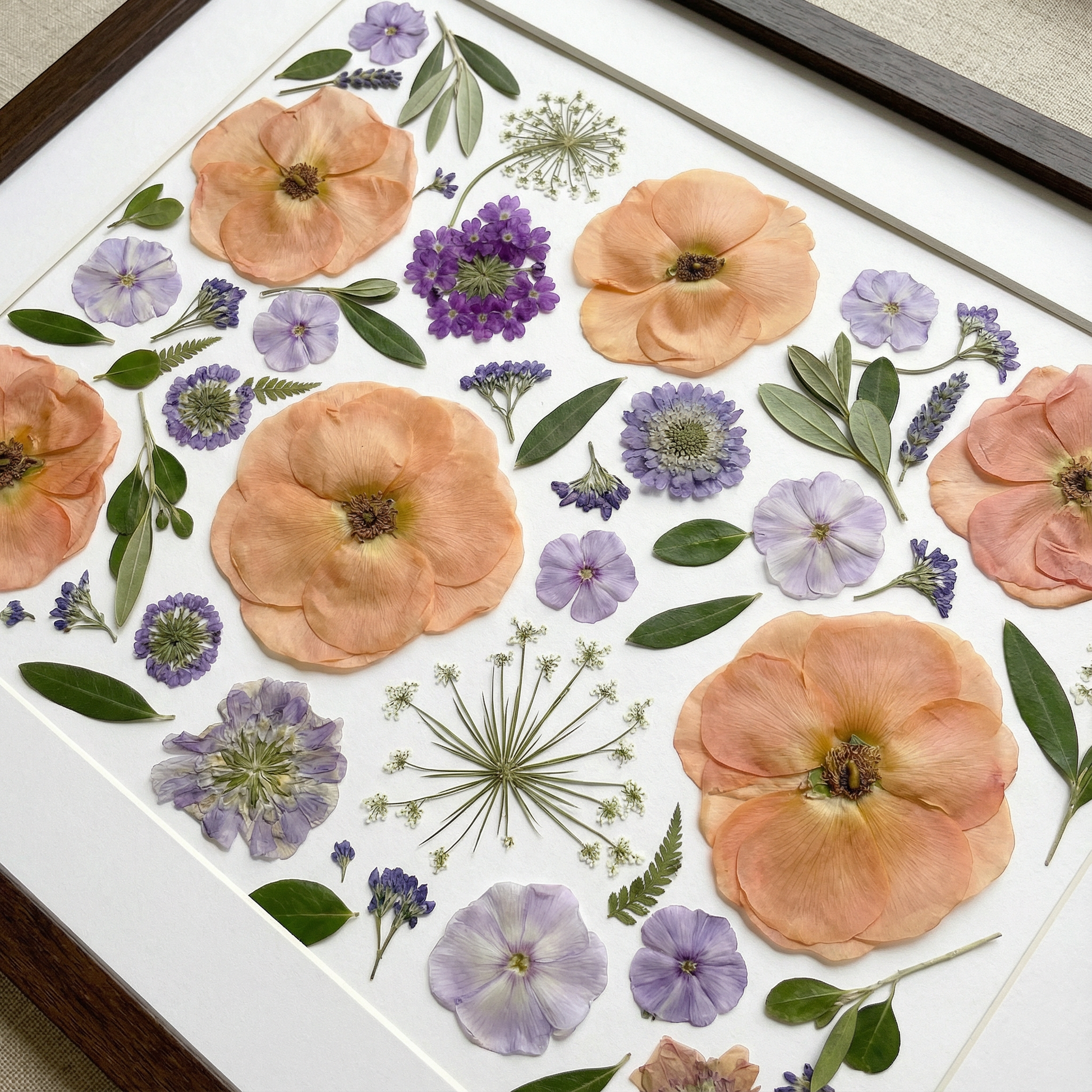 Das Kunstwerk ist mit einer transparenten Acrylplatte abgedeckt und mit einer Aluminiumrückwand versiegelt, um seine Langlebigkeit zu erhöhen und seine botanische Schönheit zu bewahren.