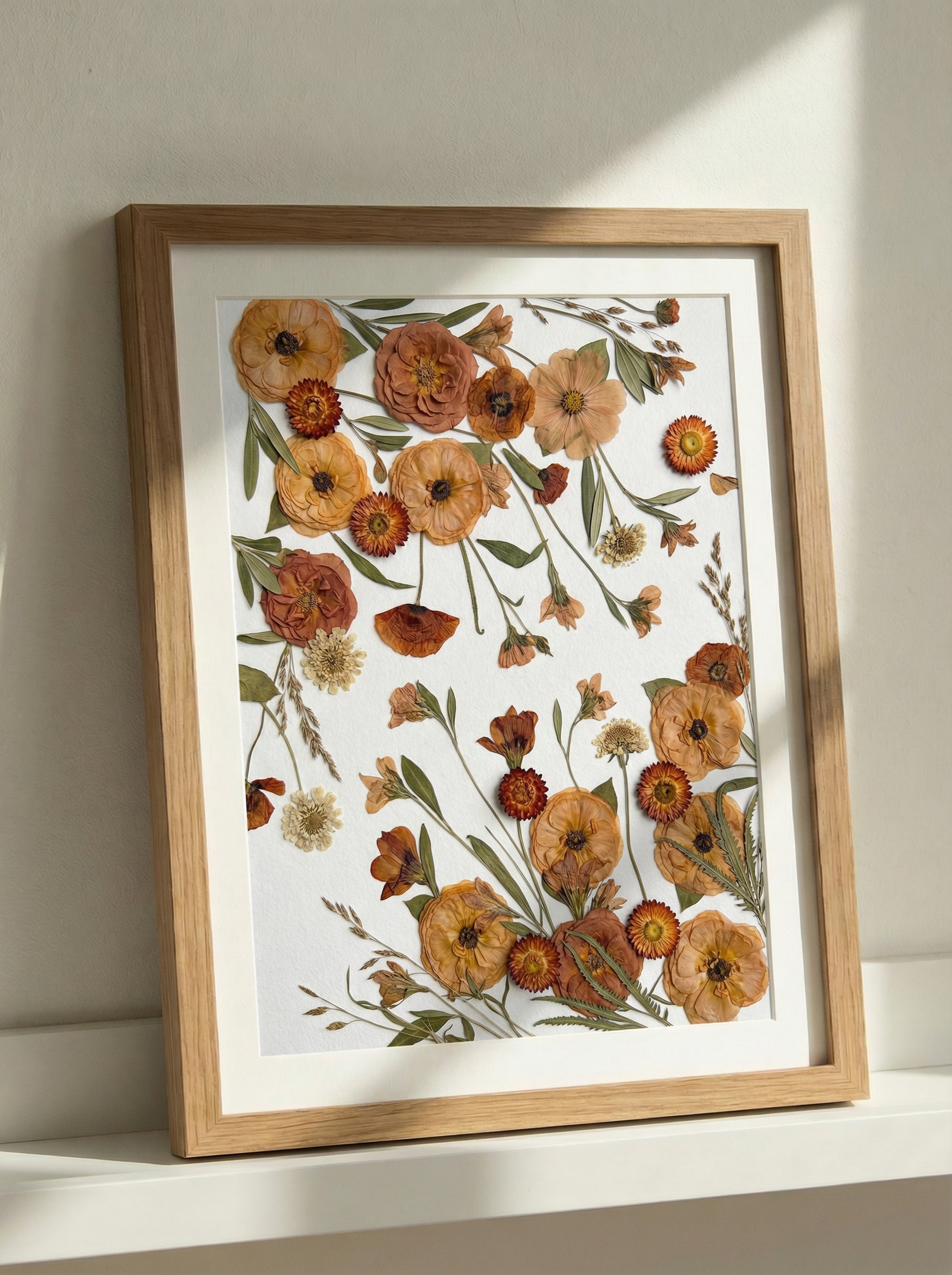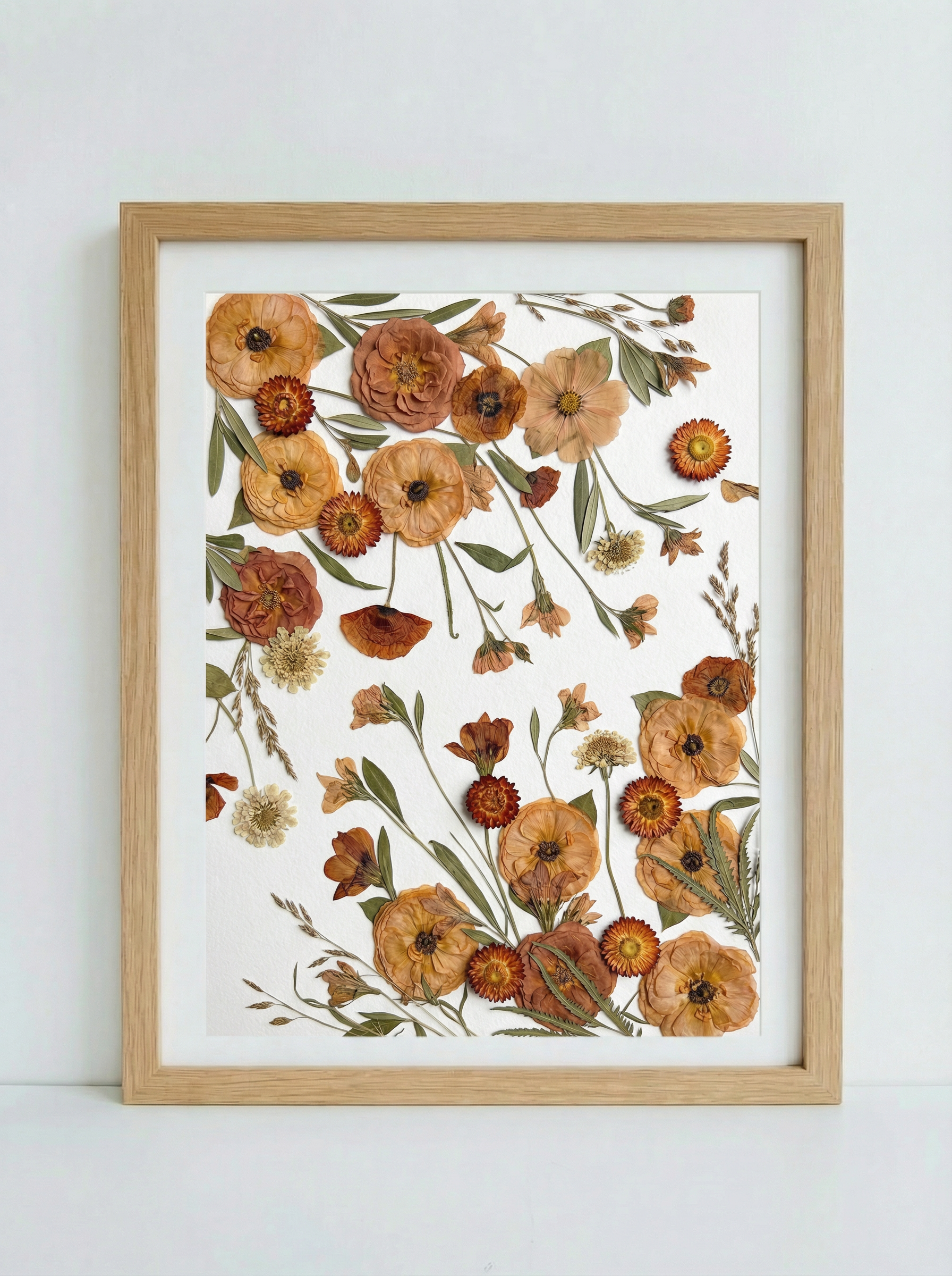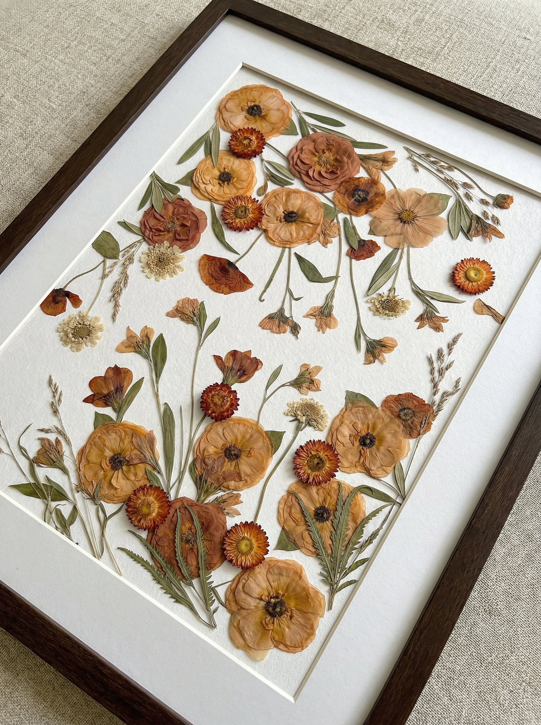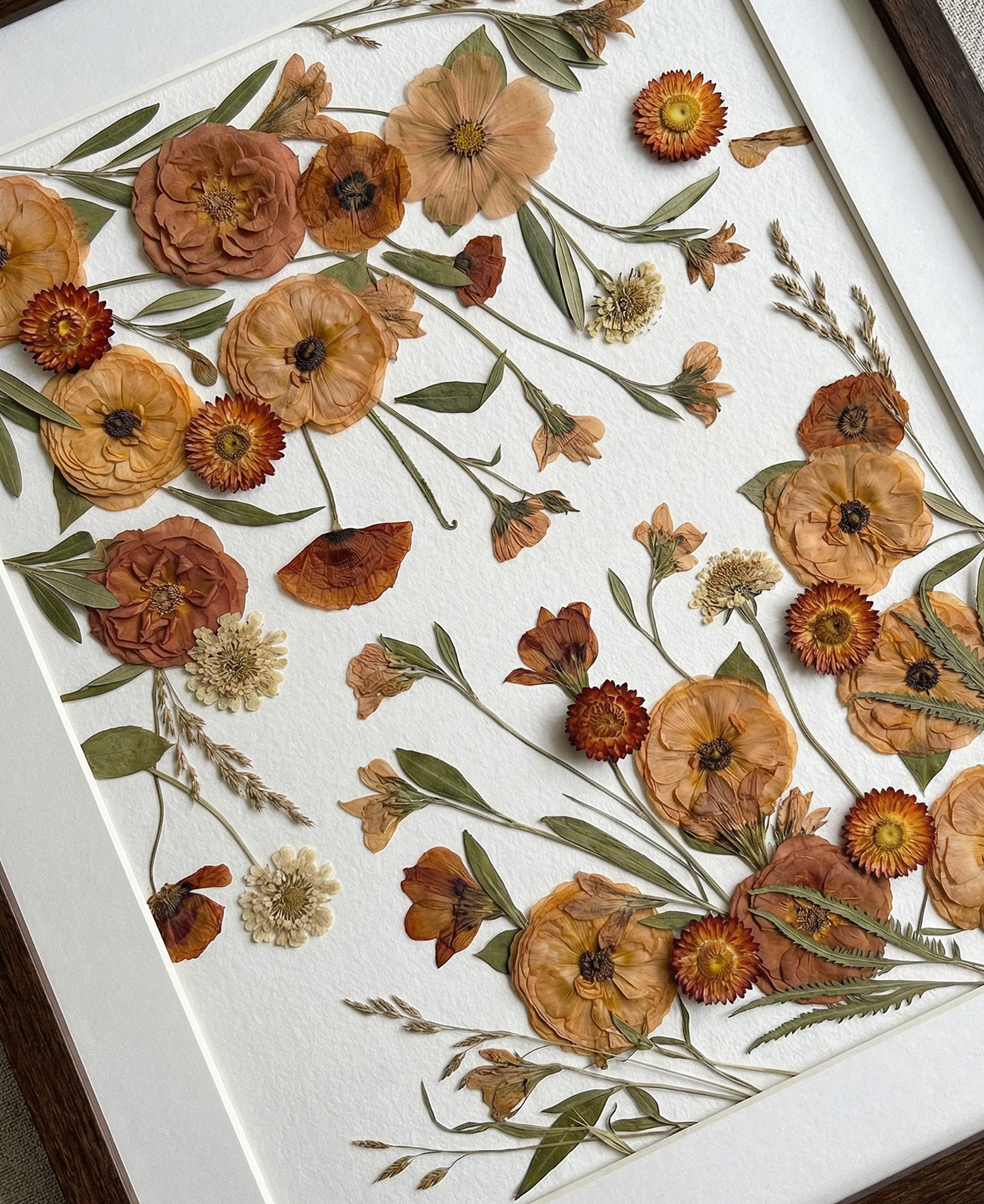 Unsere Floristin arrangiert und klebt sorgfältig getrocknete Blütenblätter auf Hintergrundpapier und kreiert so ein einzigartiges Design. Jedes Blütenblatt stammt von den schönsten saisonalen Blüten, die von unseren erfahrenen Floristen sorgfältig ausgewählt und gepresst werden.