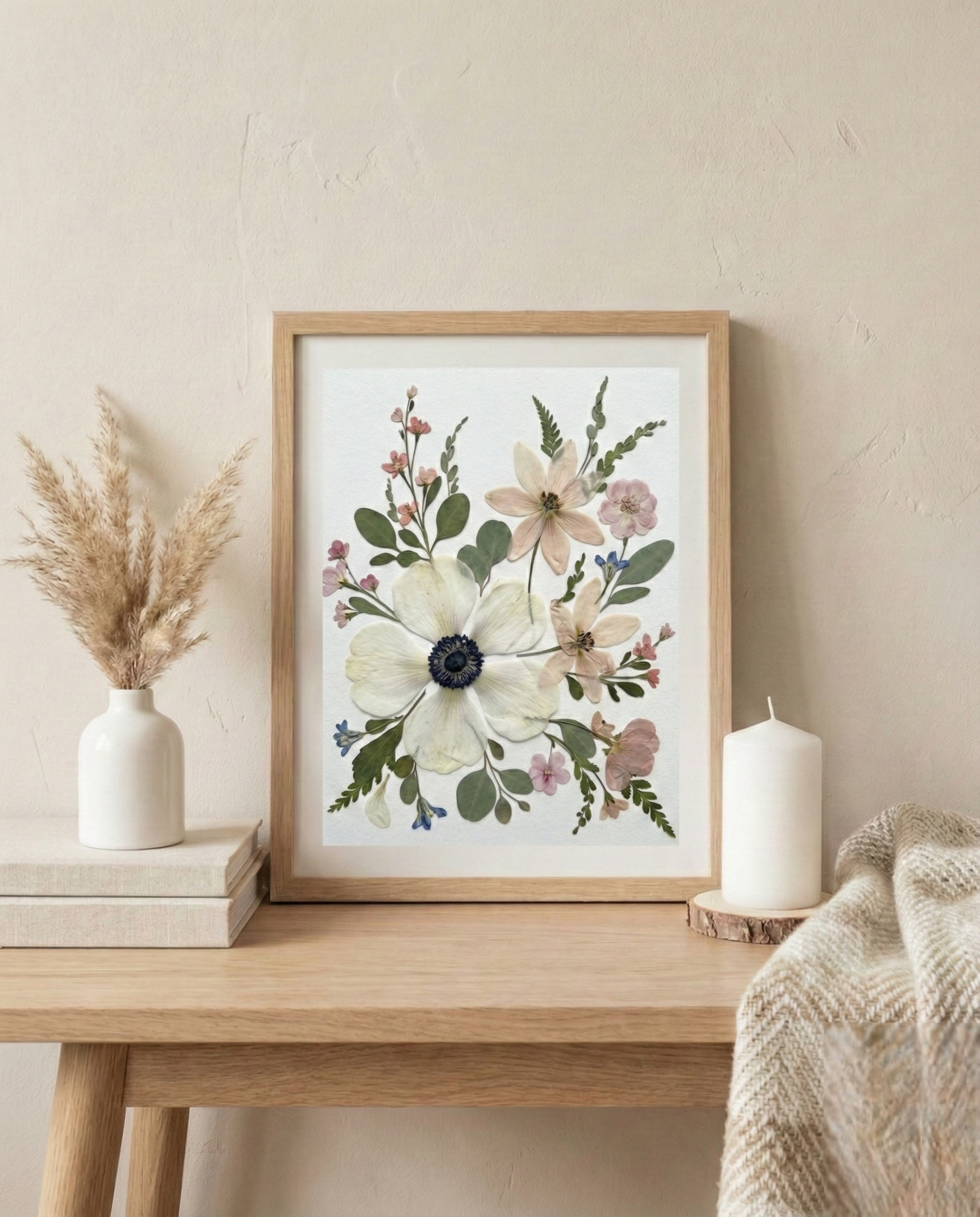 Unsere Floristin arrangiert und klebt sorgfältig getrocknete Blütenblätter auf Hintergrundpapier und kreiert so ein einzigartiges Design. Jedes Blütenblatt stammt von den schönsten saisonalen Blüten, die von unseren erfahrenen Floristen sorgfältig ausgewählt und gepresst werden.