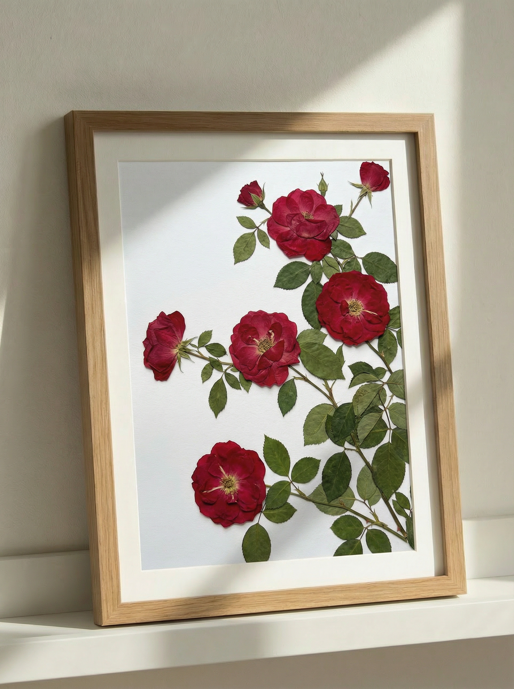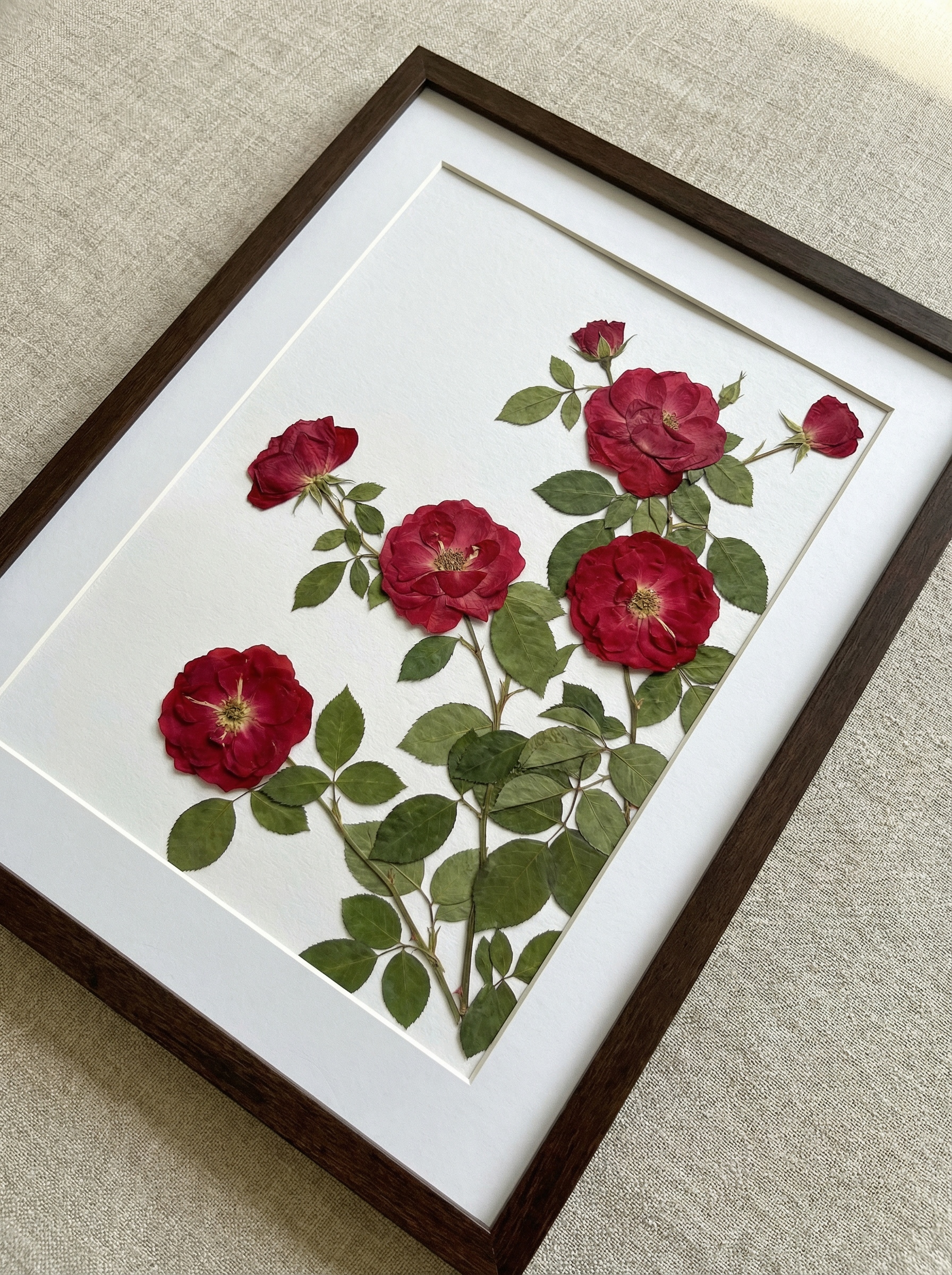 Unsere Floristin arrangiert und klebt sorgfältig getrocknete Blütenblätter auf Hintergrundpapier und kreiert so ein einzigartiges Design. Jedes Blütenblatt stammt von den schönsten saisonalen Blüten, die von unseren erfahrenen Floristen sorgfältig ausgewählt und gepresst werden.