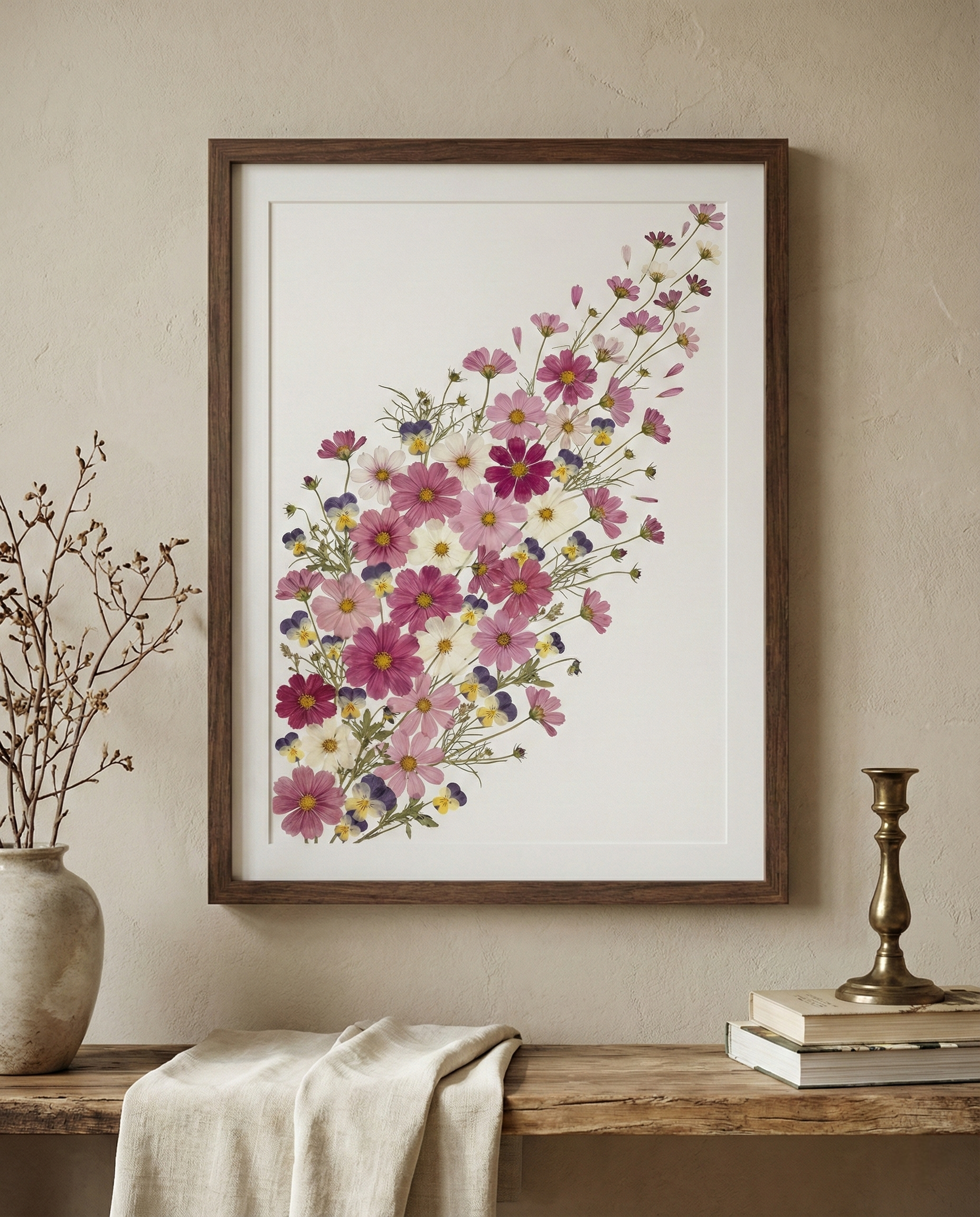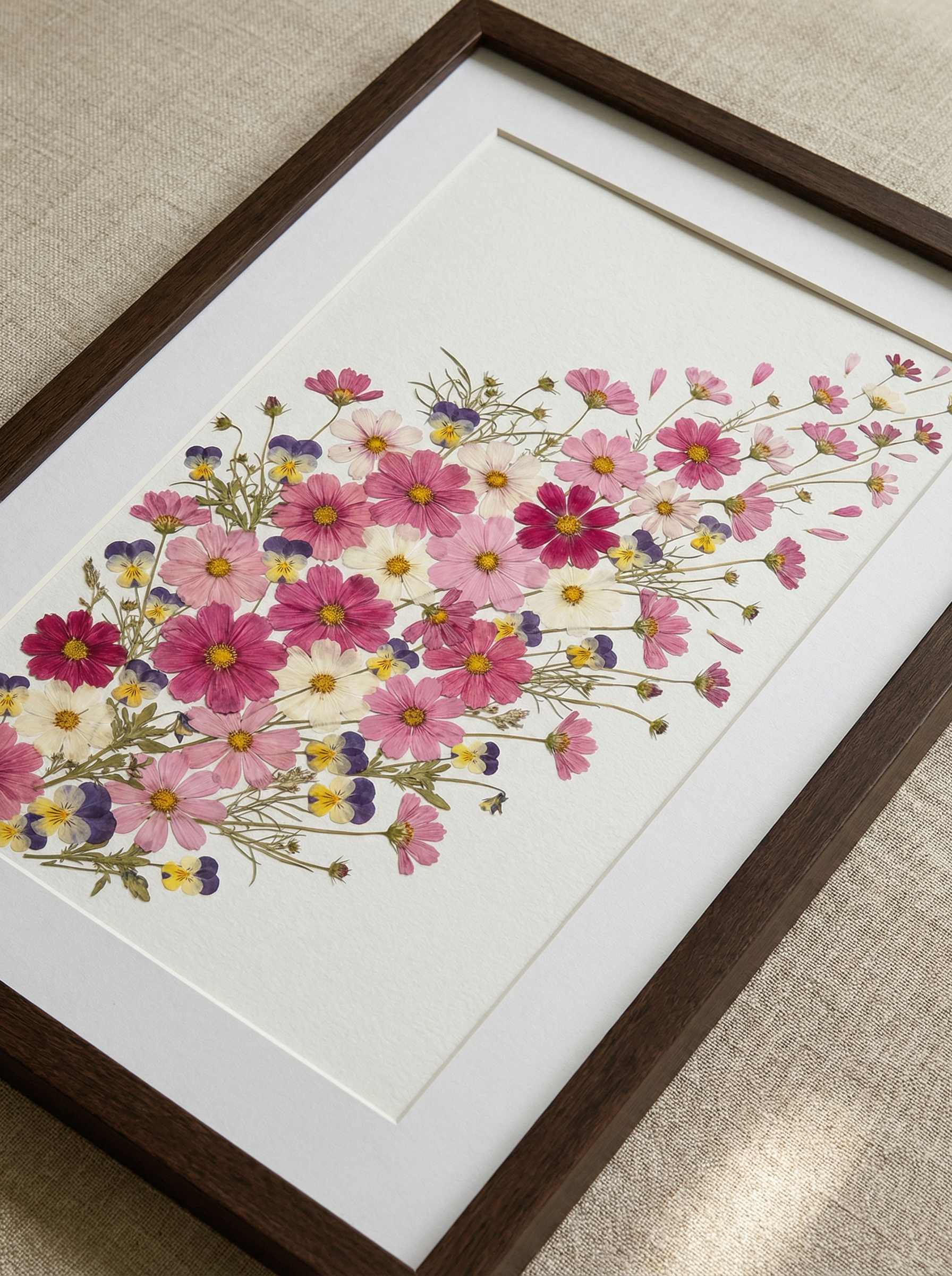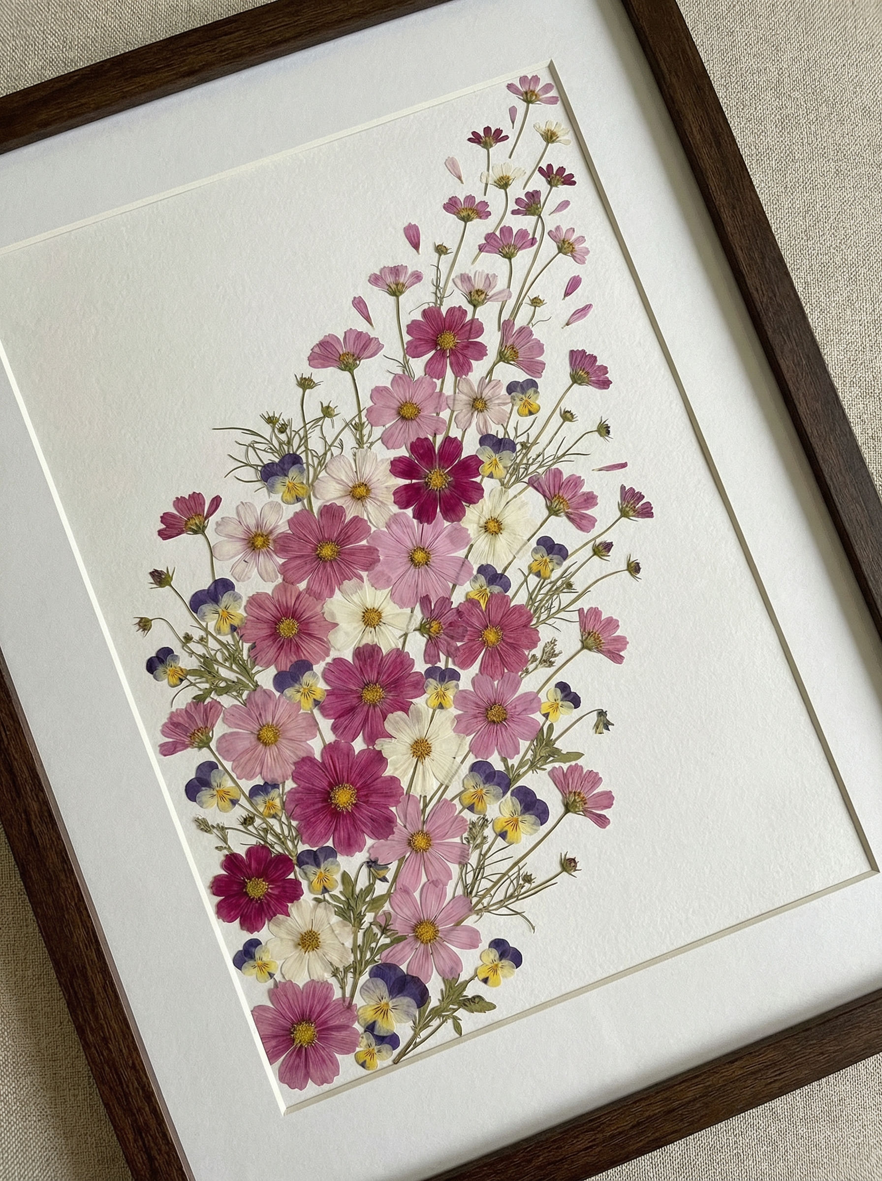 Zelebrieren Sie die tiefgründige Symbolik der 'Lebensblume' mit diesem lebendigen und kunstvoll arrangierten Stück handgepresster Botanik aus unserem International Artisan Studio. Es präsentiert ein reiches Spektrum an Schmuckkörbchen, von zarten Rosatönen bis hin zu kräftigem Magenta und strahlendem Weiß, wobei jede Blüte ihren einzigartigen Zauber ausstrahlt.