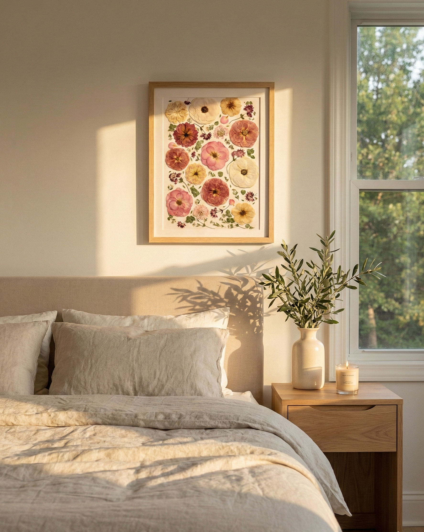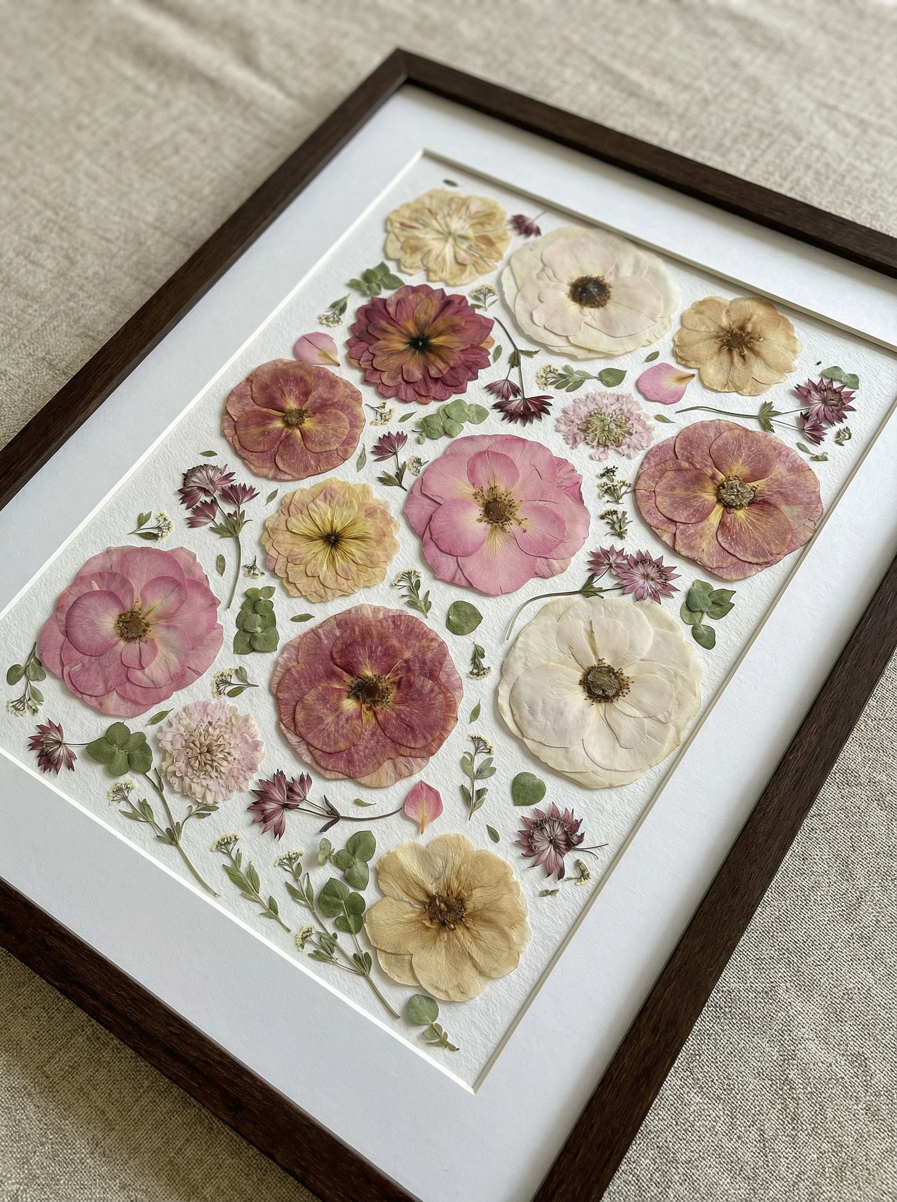 Unsere Floristin arrangiert und klebt sorgfältig getrocknete Blütenblätter auf Hintergrundpapier und kreiert so ein einzigartiges Design. Jedes Blütenblatt stammt von den schönsten saisonalen Blüten, die von unseren erfahrenen Floristen sorgfältig ausgewählt und gepresst werden.