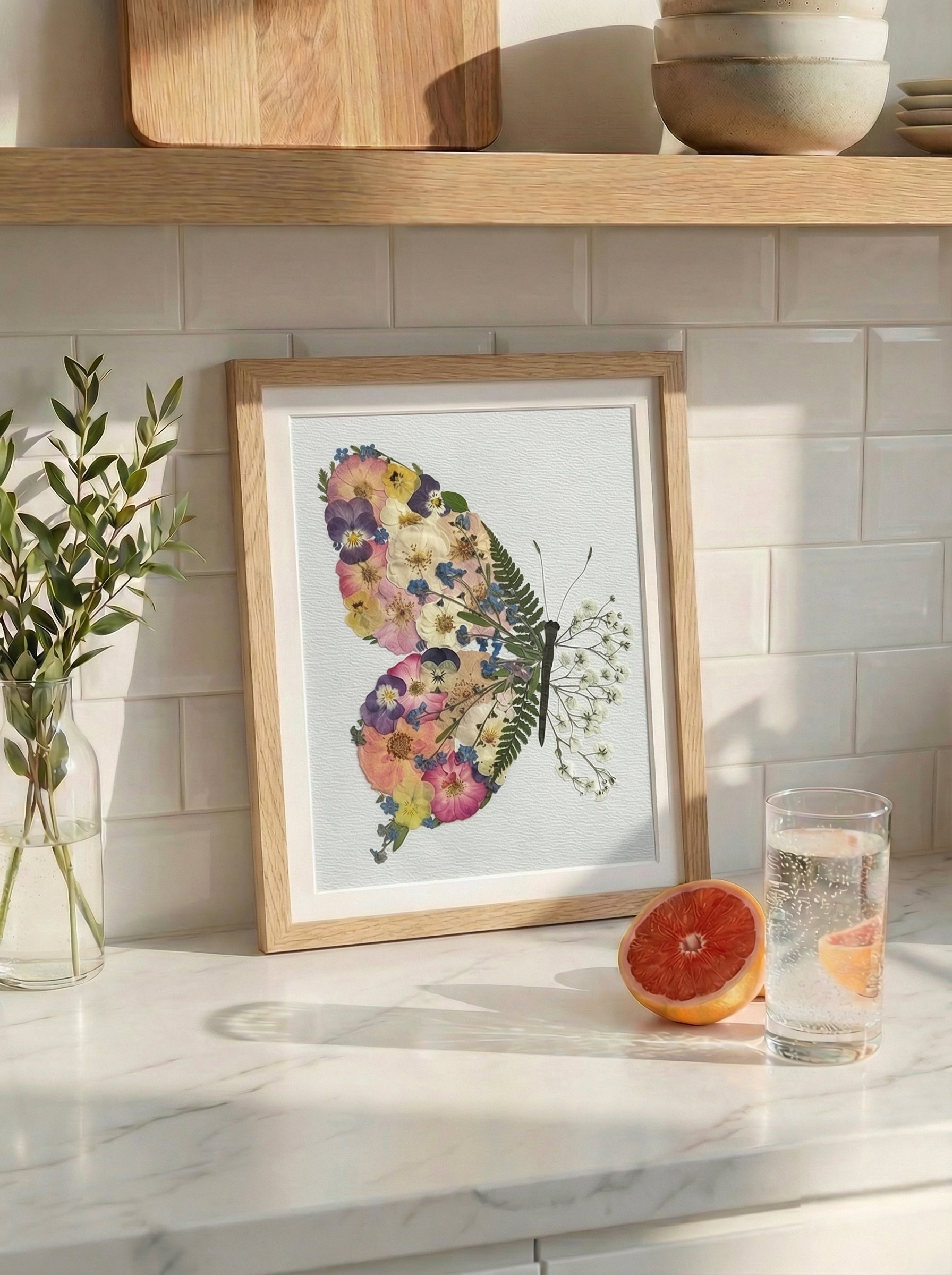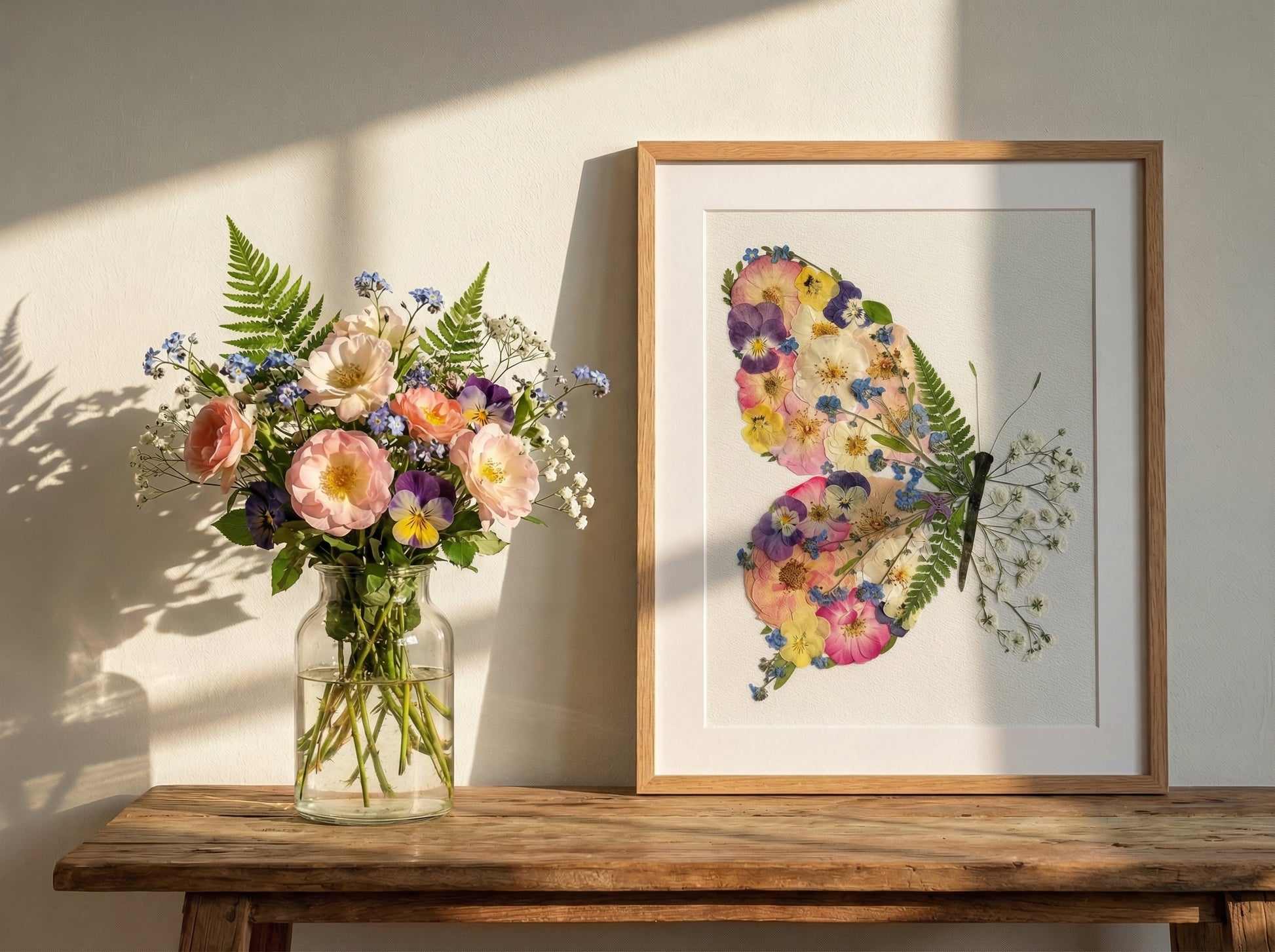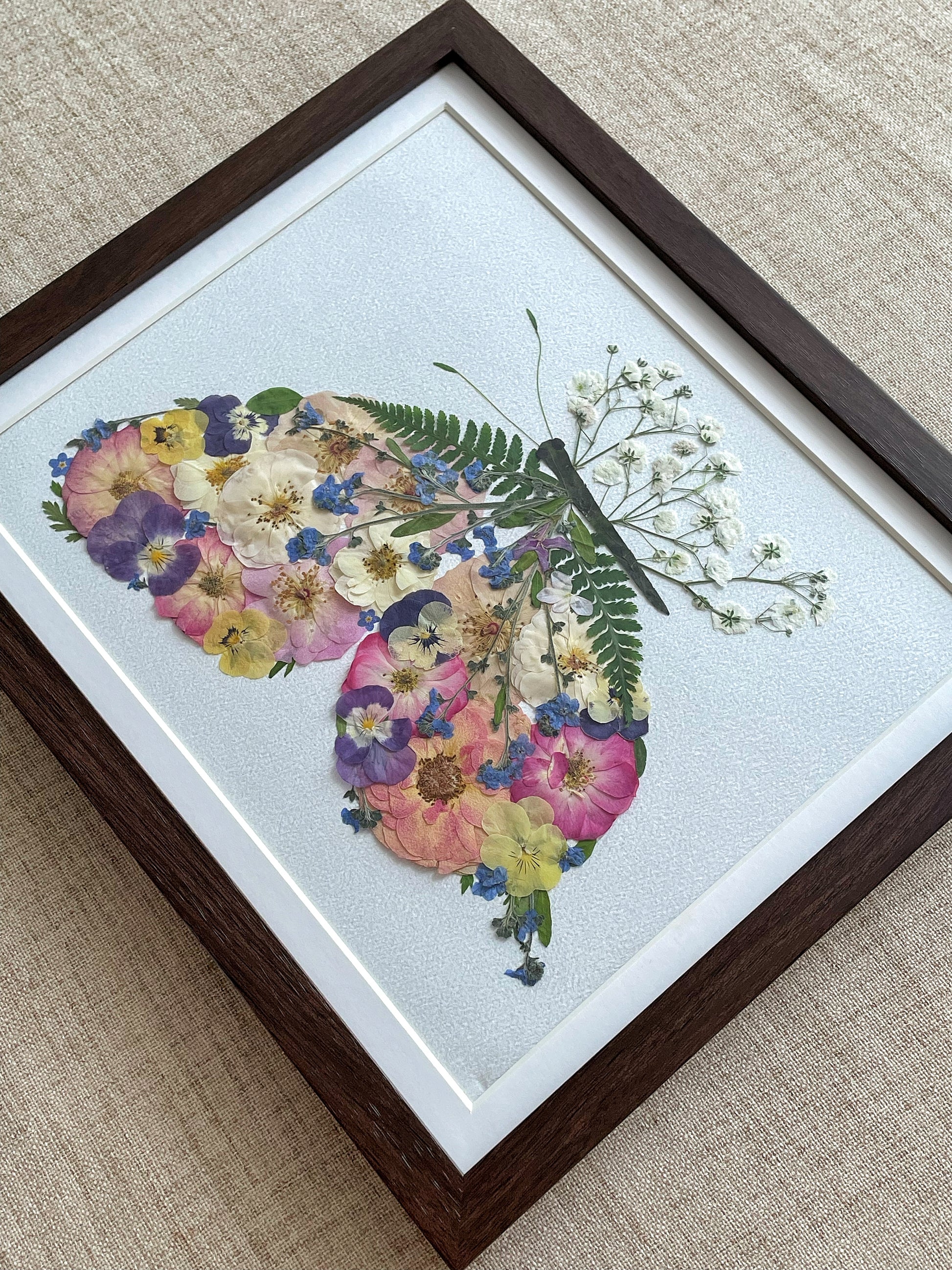Ein Hauch von Magie entfaltet sich mit der 'Schmetterlingsflügel' gepressten Blütenkunst. Dieses Kunstwerk, das zart zu einem bezaubernden Schmetterling arrangiert wurde, zeigt das sanfte Erröten von Rosenblättern (Rosa), die charmanten Gesichter von Gartenstiefmütterchen (Viola × wittrockiana) und die ätherischen blauen Punkte von Vergissmeinnicht (Myosotis), alle umschlossen von den zarten Wedeln eines Frauenhaarfarns (Adiantum) als Körper.
