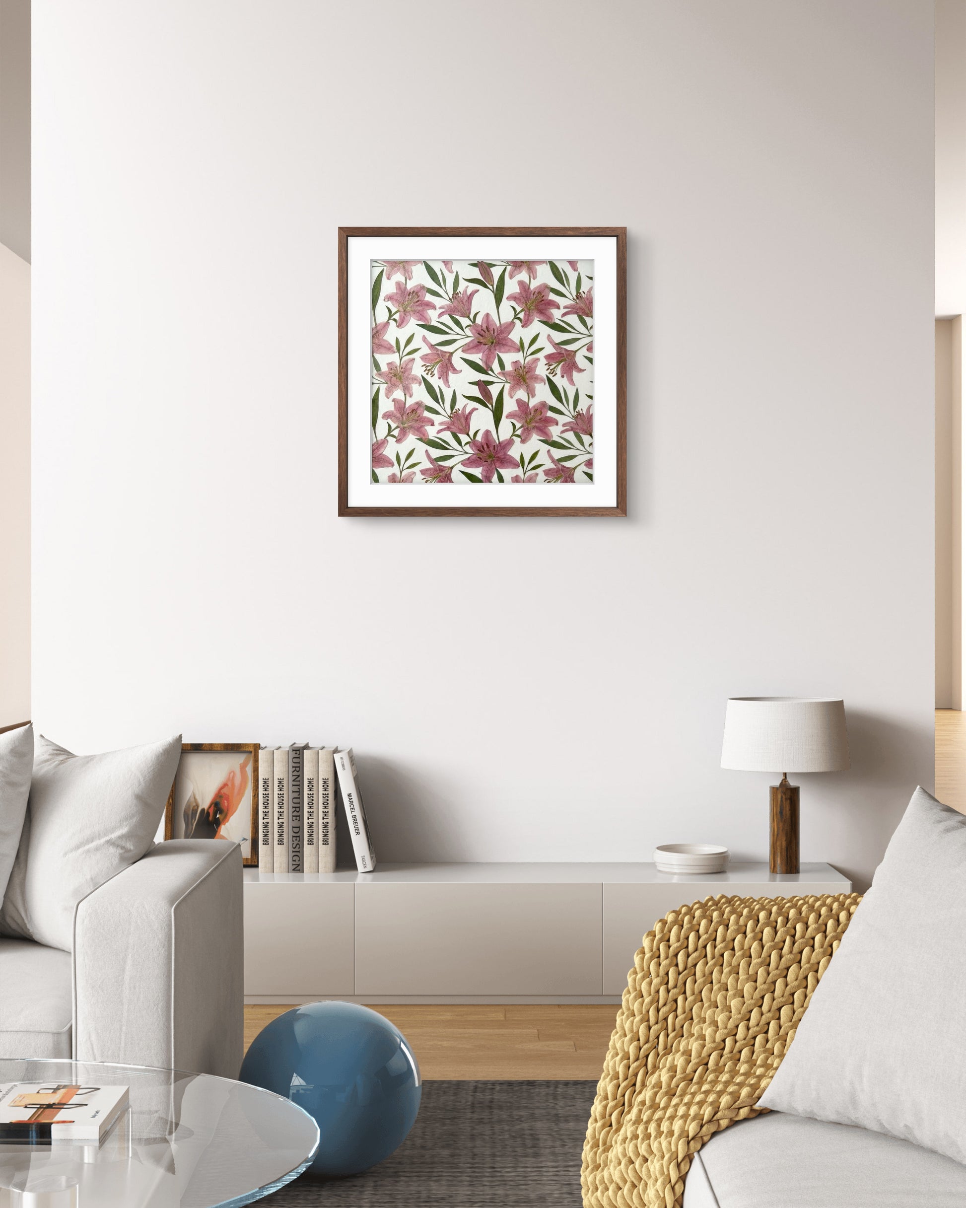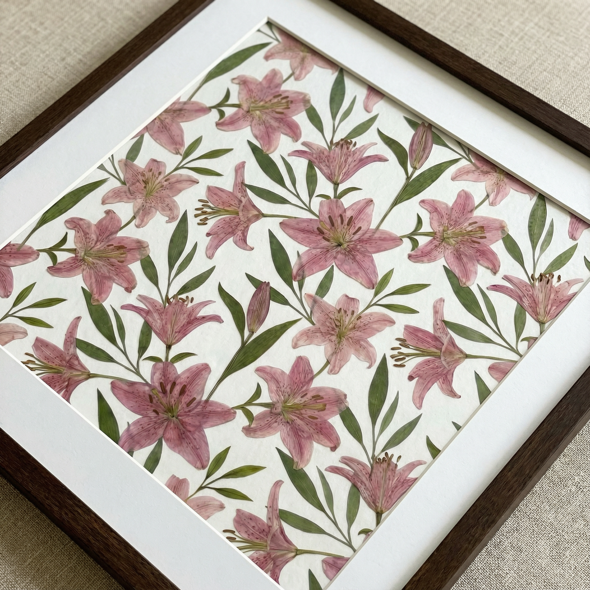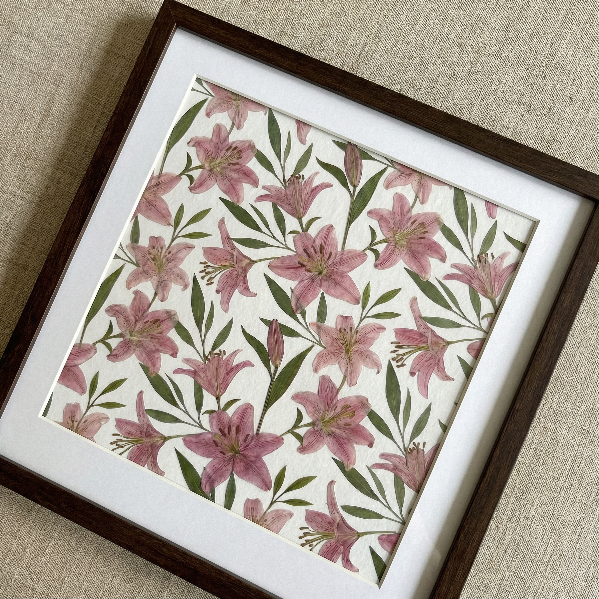 Das Kunstwerk ist mit einer transparenten Acrylplatte abgedeckt und mit einer Aluminiumrückwand versiegelt, um seine Langlebigkeit zu erhöhen und seine botanische Schönheit zu bewahren.