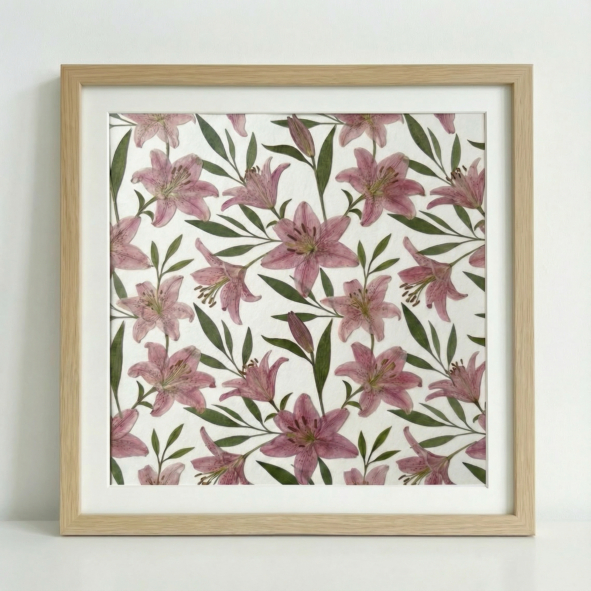 ▪ Material: Rosa Lilien mit schlanken Lilienblättern und ungeöffneten Lilienknospen.