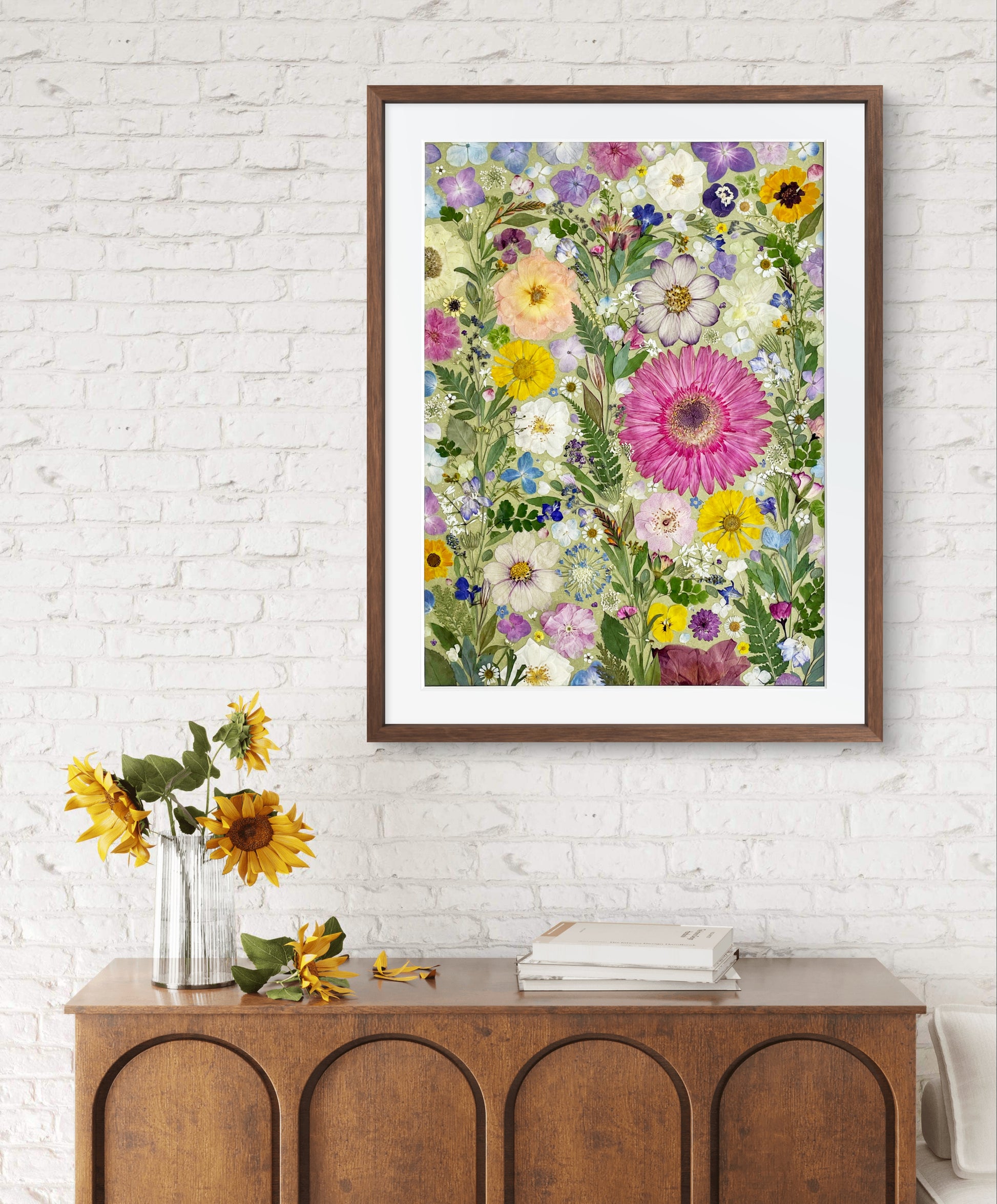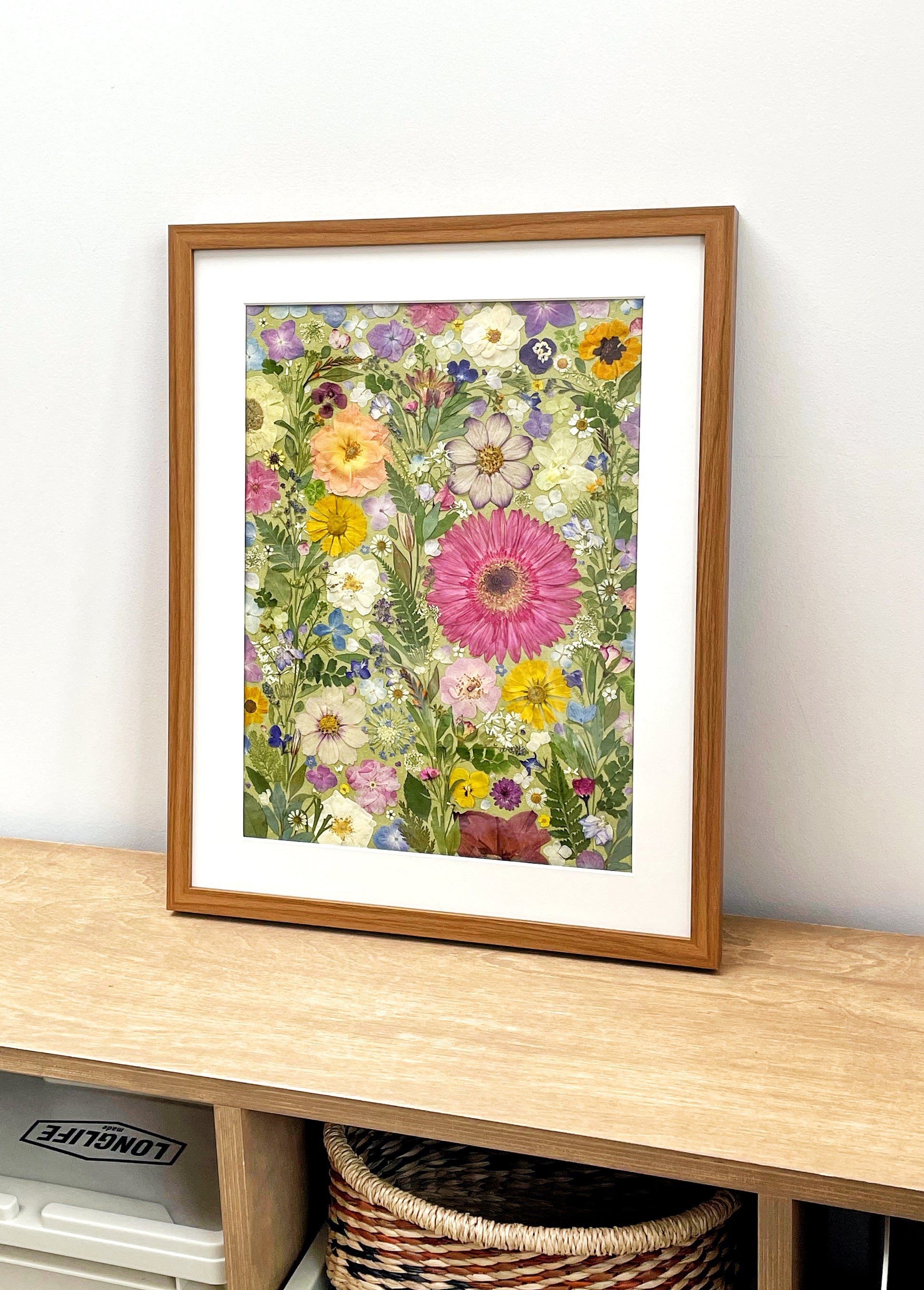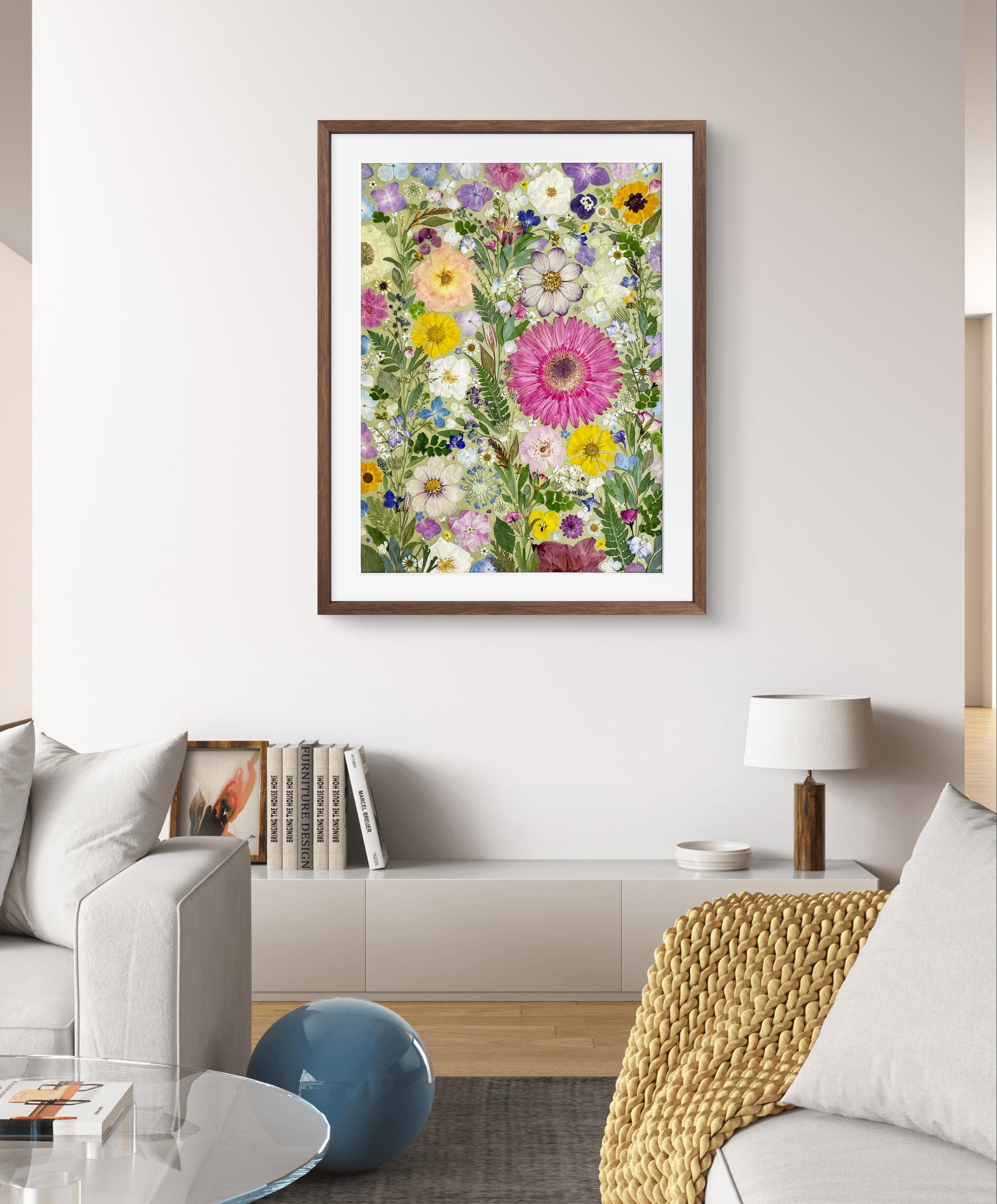 Dies ist ein großformatiges, gerahmtes Kunstwerk aus gepressten Blütenblättern. Unsere Floristin arrangiert und klebt sorgfältig getrocknete Blütenblätter auf Hintergrundpapier und schafft so ein einzigartiges Design. Jedes Blütenblatt stammt von den schönsten saisonalen Blüten, die sorgfältig ausgewählt wurden. Von unseren erfahrenen Floristen gepresst.
