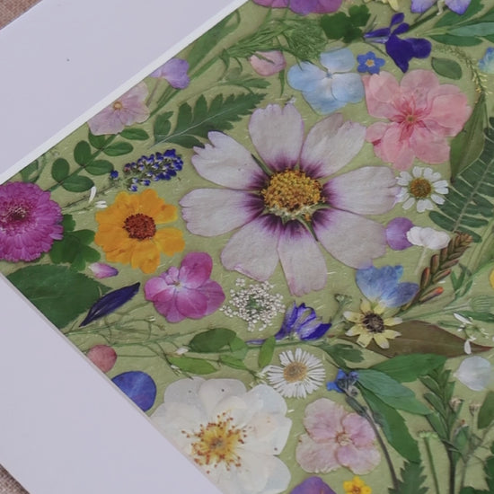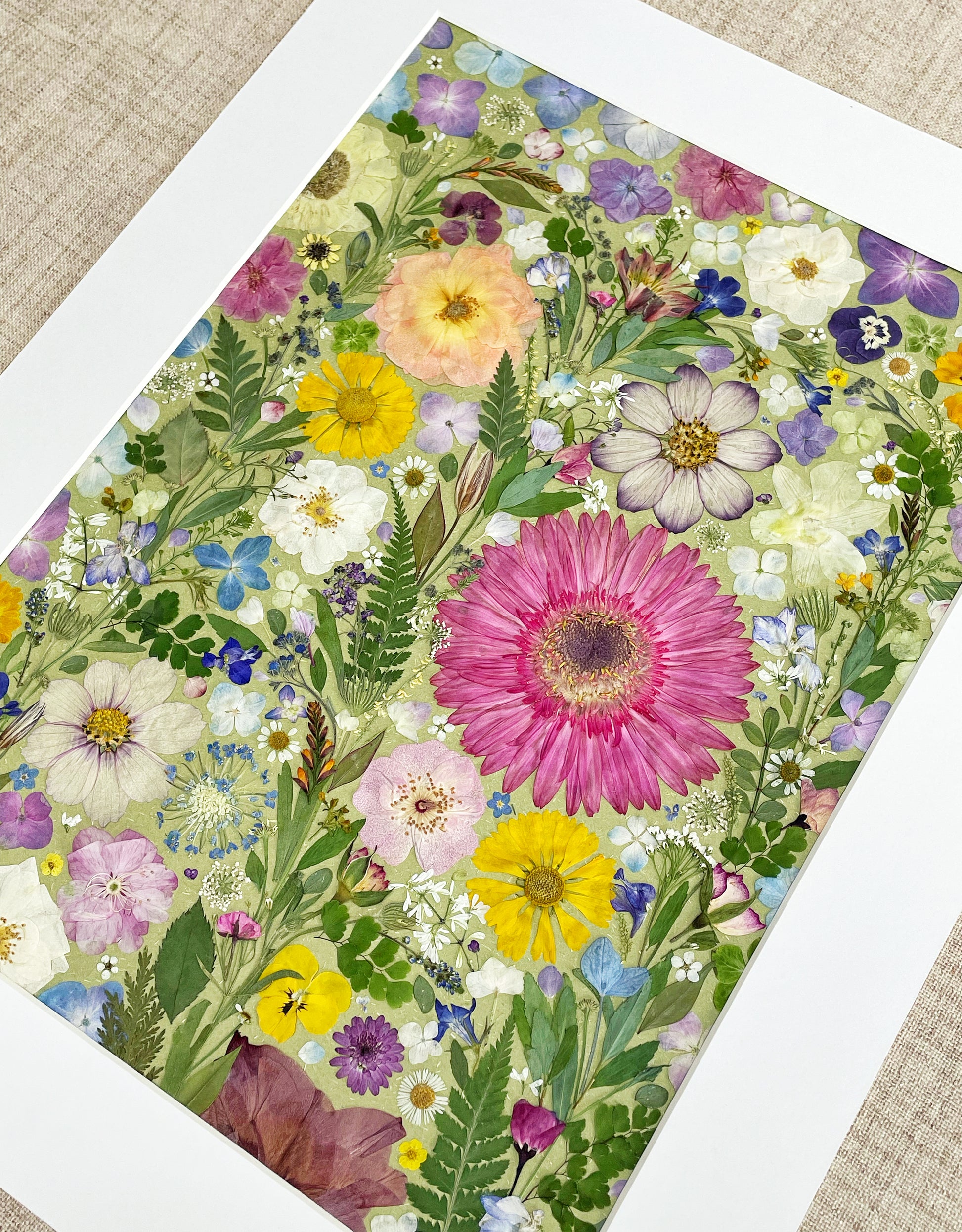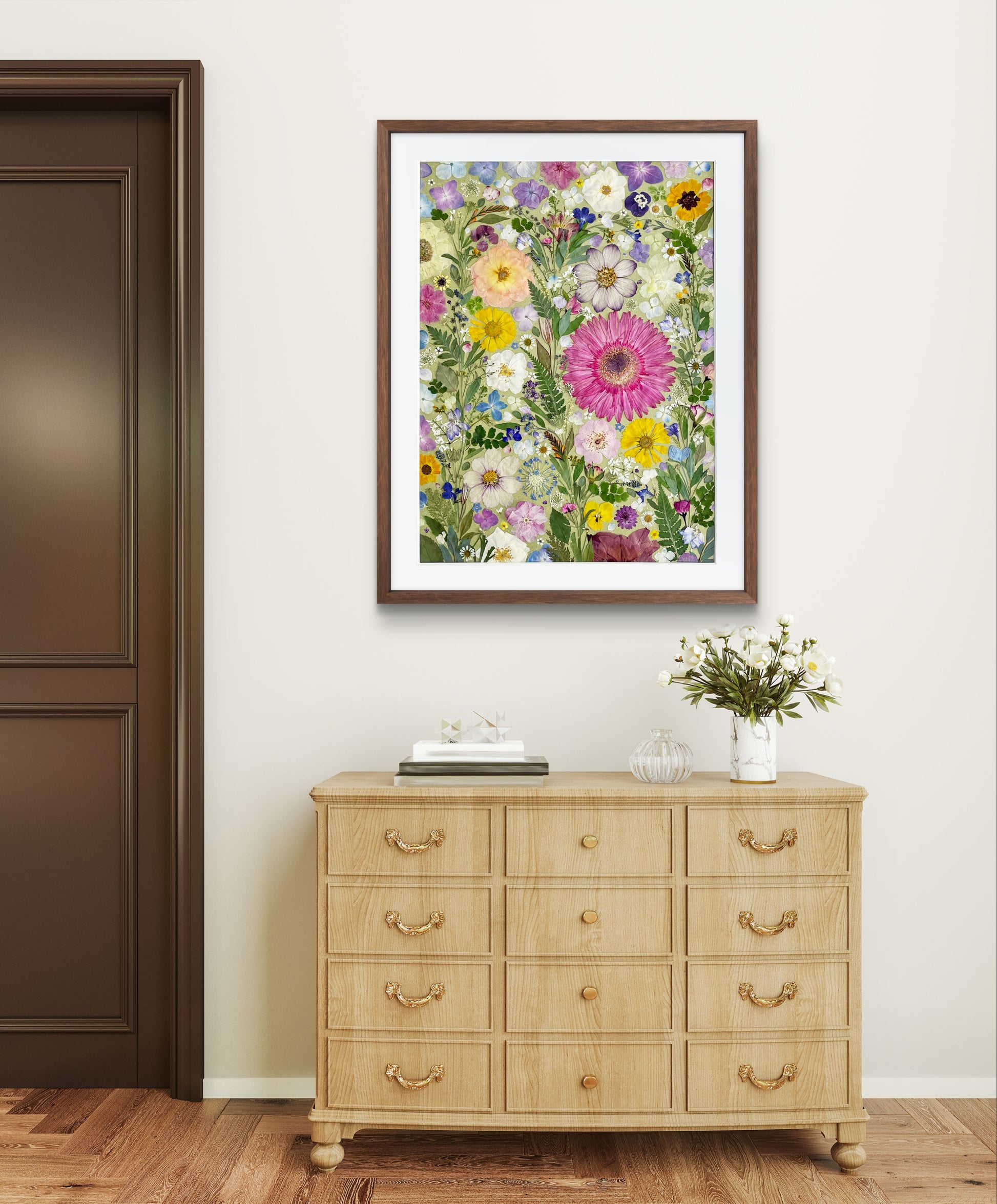 Dies ist ein großformatiges, gerahmtes Kunstwerk aus gepressten Blütenblättern. Unsere Floristin arrangiert und klebt sorgfältig getrocknete Blütenblätter auf Hintergrundpapier und schafft so ein einzigartiges Design. Jedes Blütenblatt stammt von den schönsten saisonalen Blüten, die sorgfältig ausgewählt wurden. Von unseren erfahrenen Floristen gepresst.