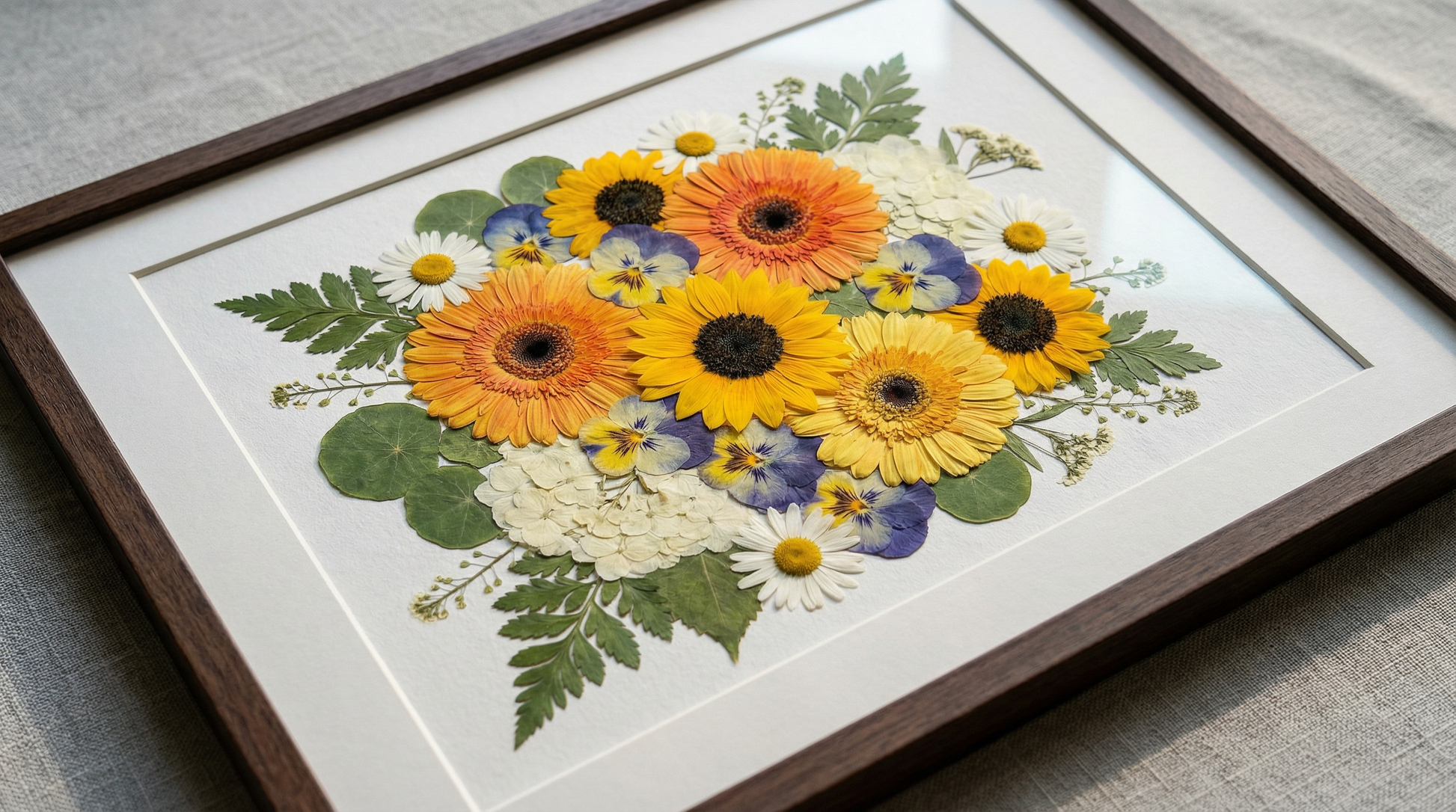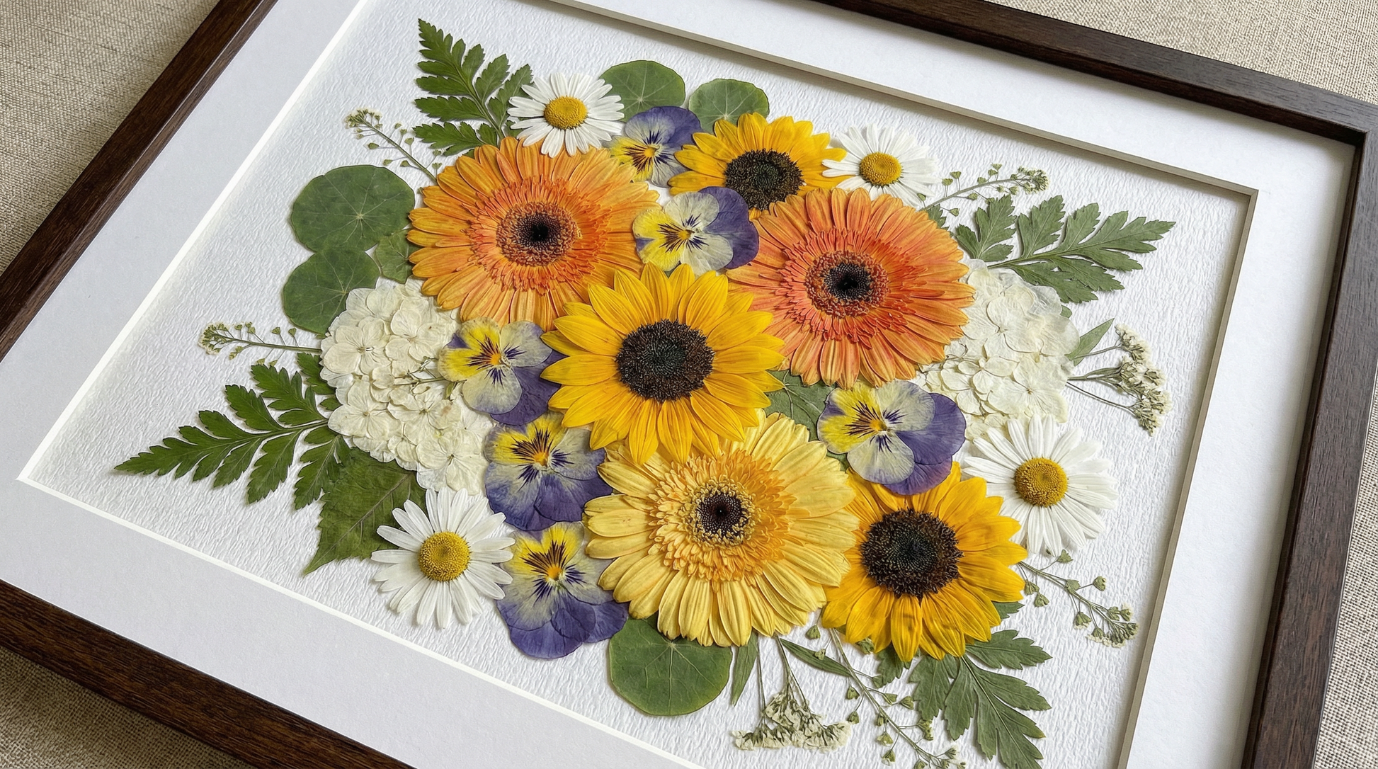 Unsere Floristin arrangiert und klebt sorgfältig getrocknete Blütenblätter auf Hintergrundpapier und kreiert so ein einzigartiges Design. Jedes Blütenblatt stammt von den schönsten saisonalen Blüten, die von unseren erfahrenen Floristen sorgfältig ausgewählt und gepresst werden.