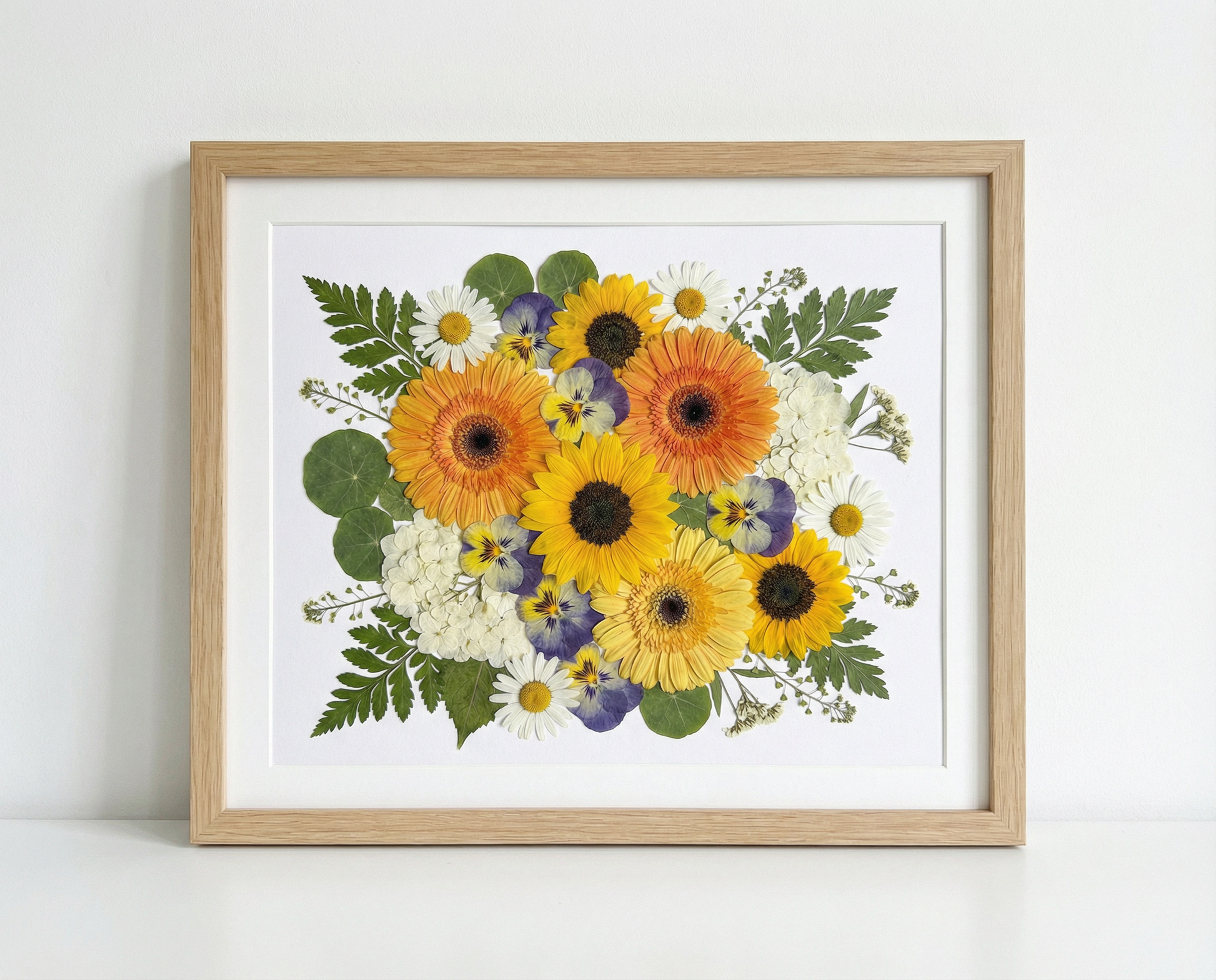 ▪ Material: Sonnenblume, Gerbera, Stiefmütterchen, Weiße Gänseblümchen, Hortensie, Schleierkraut, Farnblätter und Eukalyptusblätter.