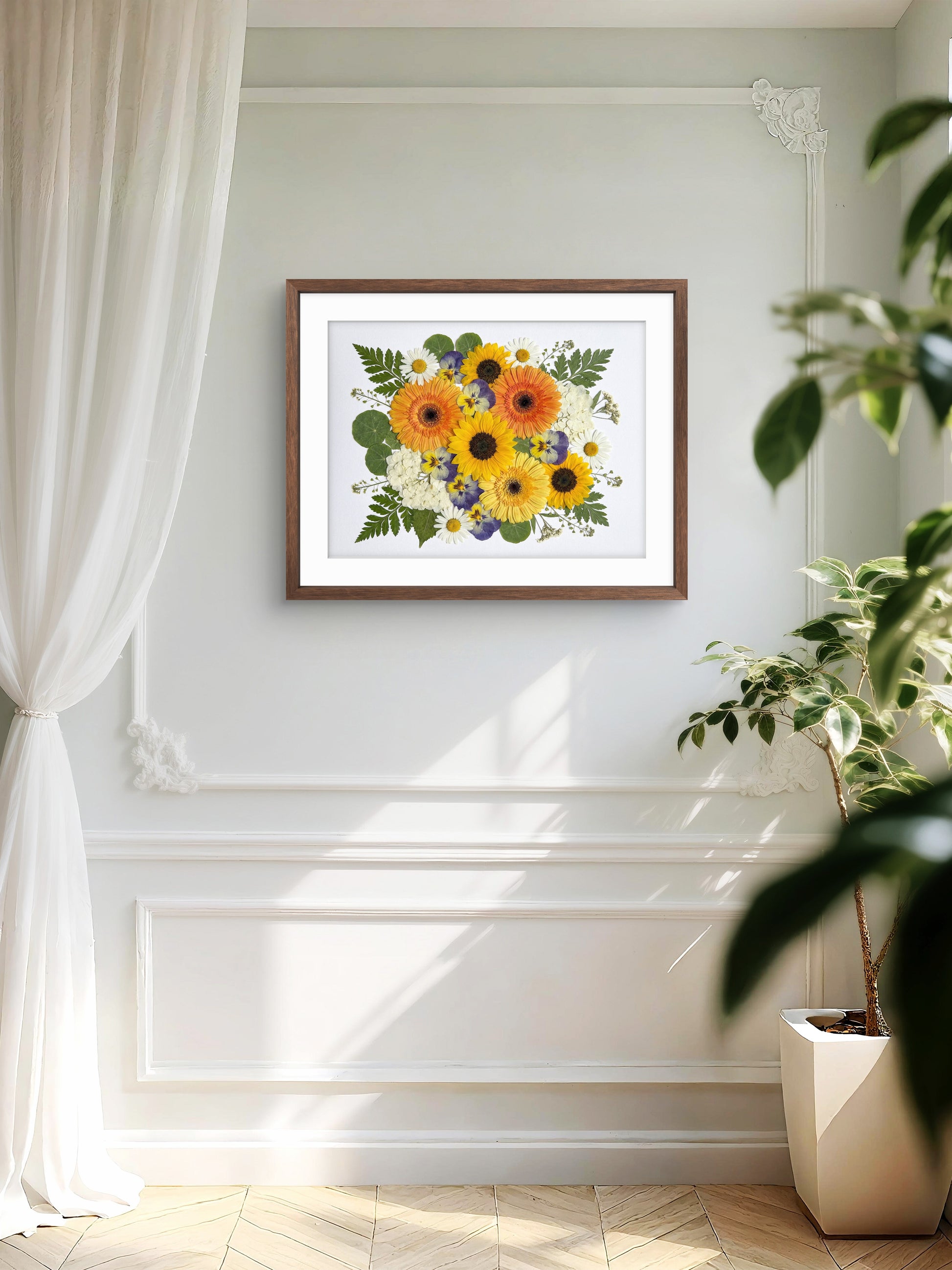 Das Kunstwerk ist mit einer transparenten Acrylplatte abgedeckt und mit einer Aluminiumrückwand versiegelt, um seine Langlebigkeit zu erhöhen und seine botanische Schönheit zu bewahren.