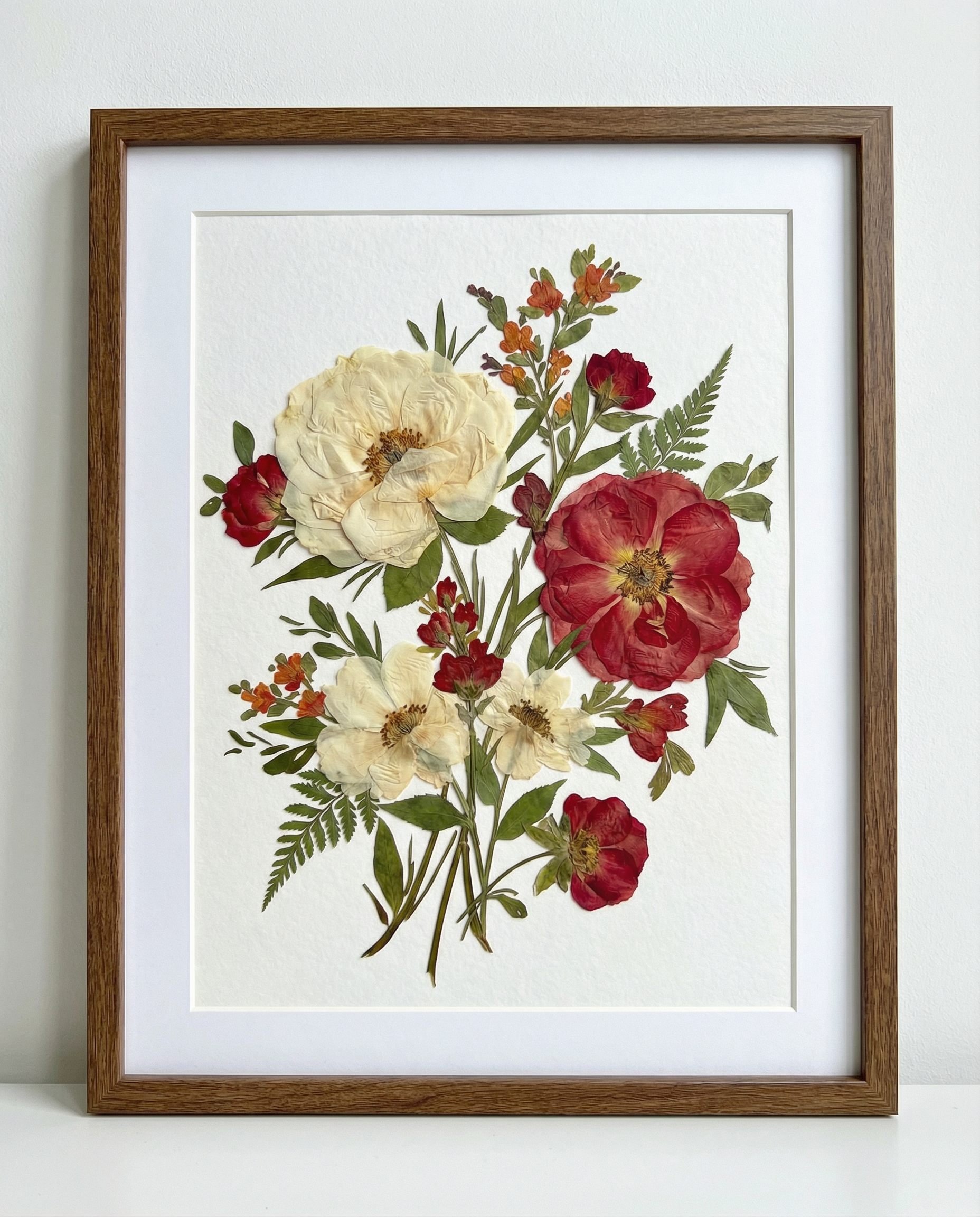 Unsere Floristin arrangiert und klebt sorgfältig getrocknete Blütenblätter auf Hintergrundpapier und kreiert so ein einzigartiges Design. Jedes Blütenblatt stammt von den schönsten saisonalen Blüten, die von unseren erfahrenen Floristen sorgfältig ausgewählt und gepresst werden.