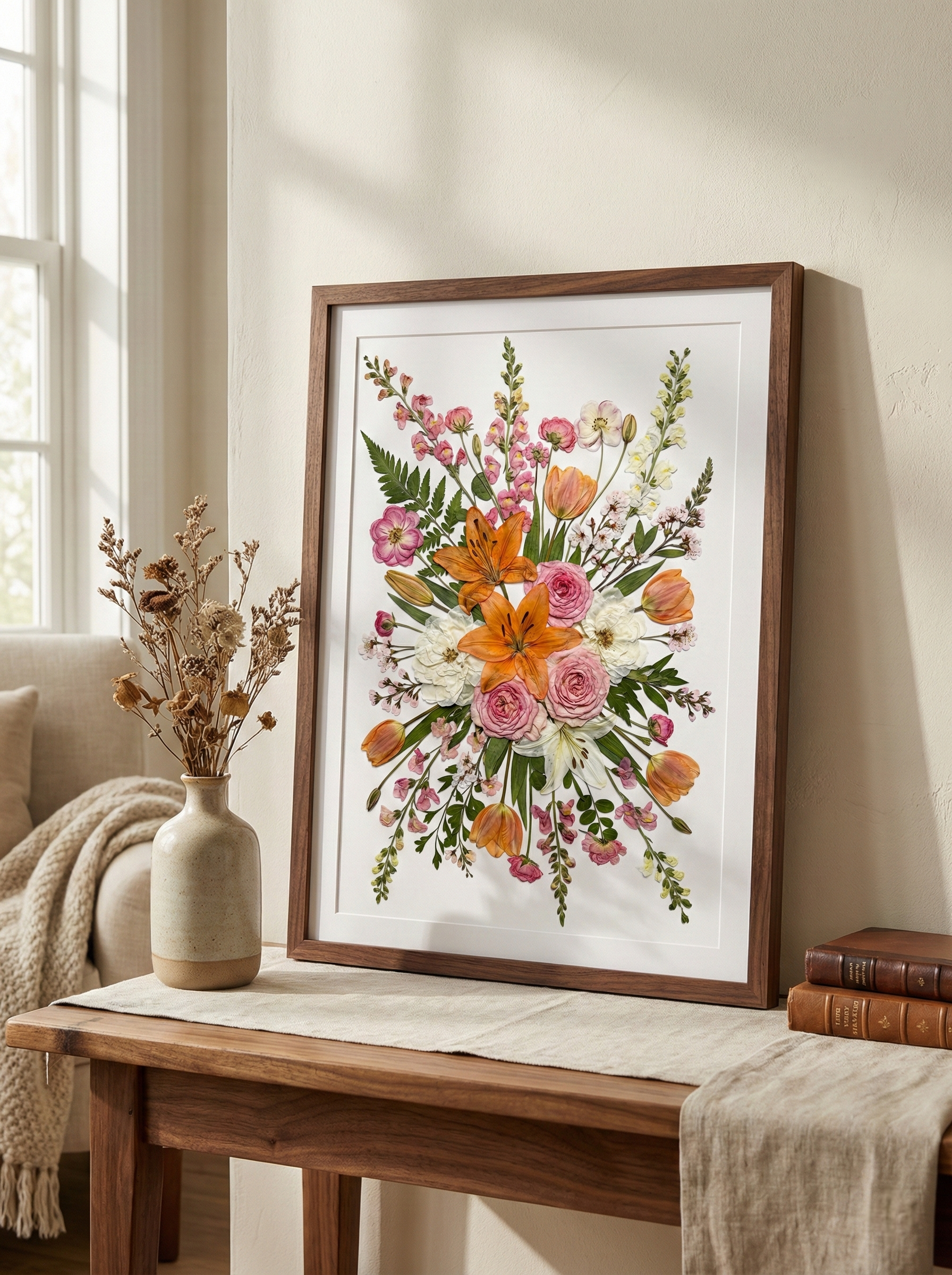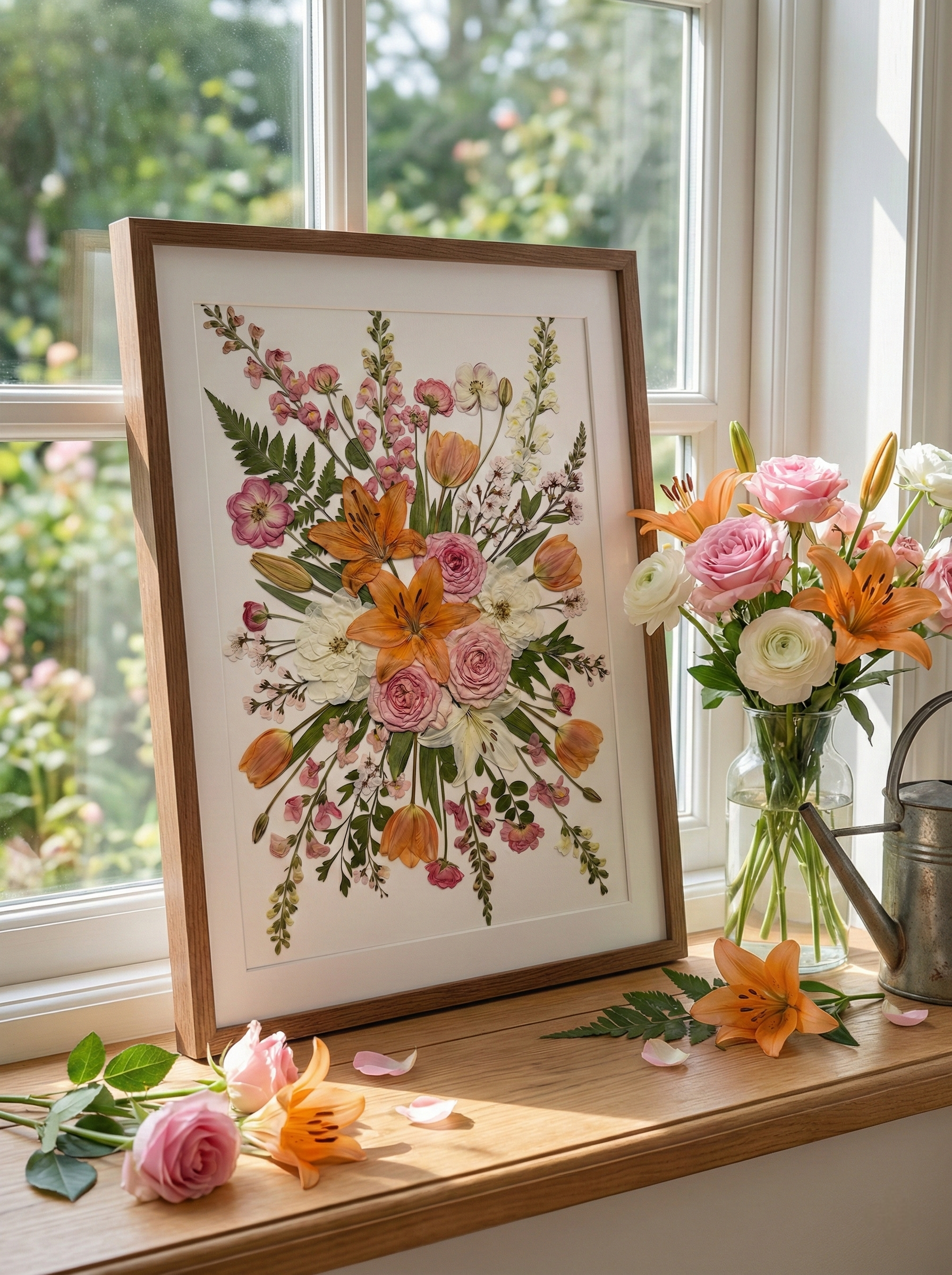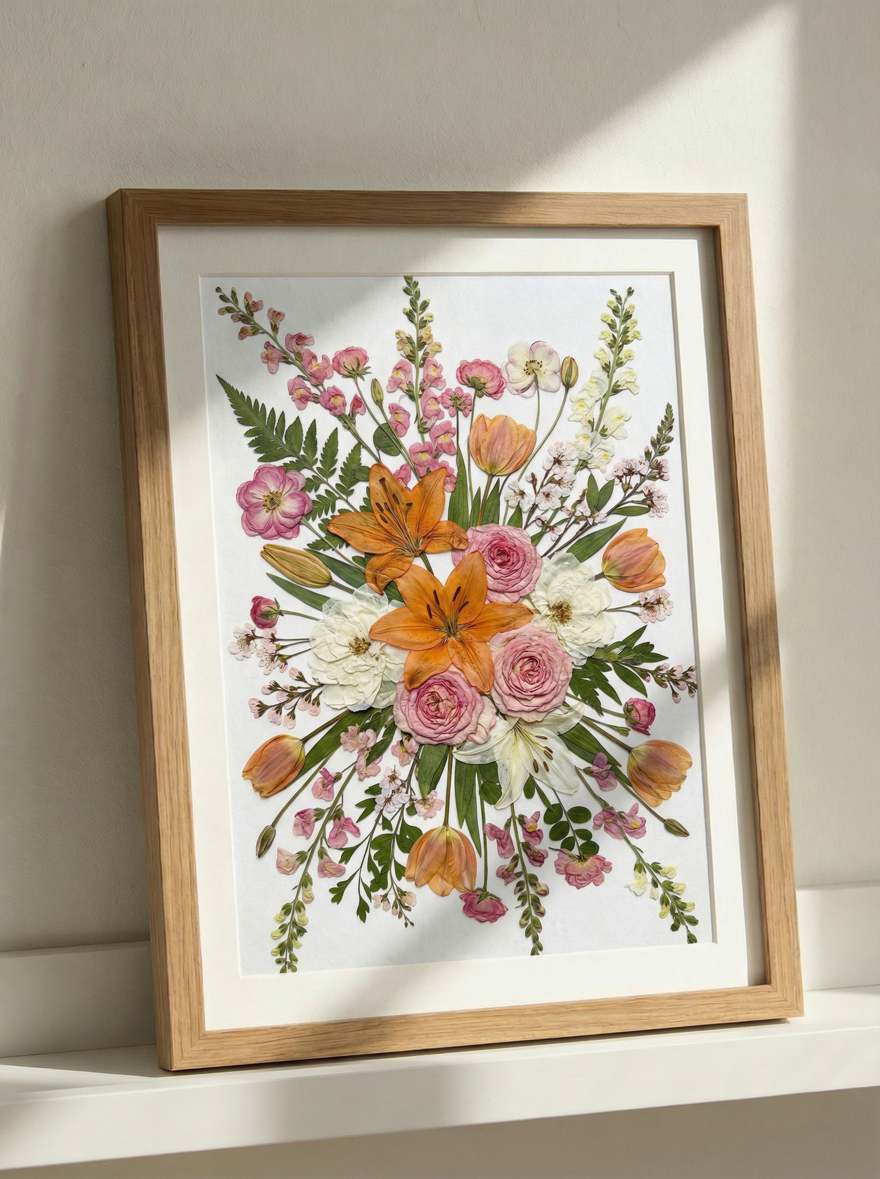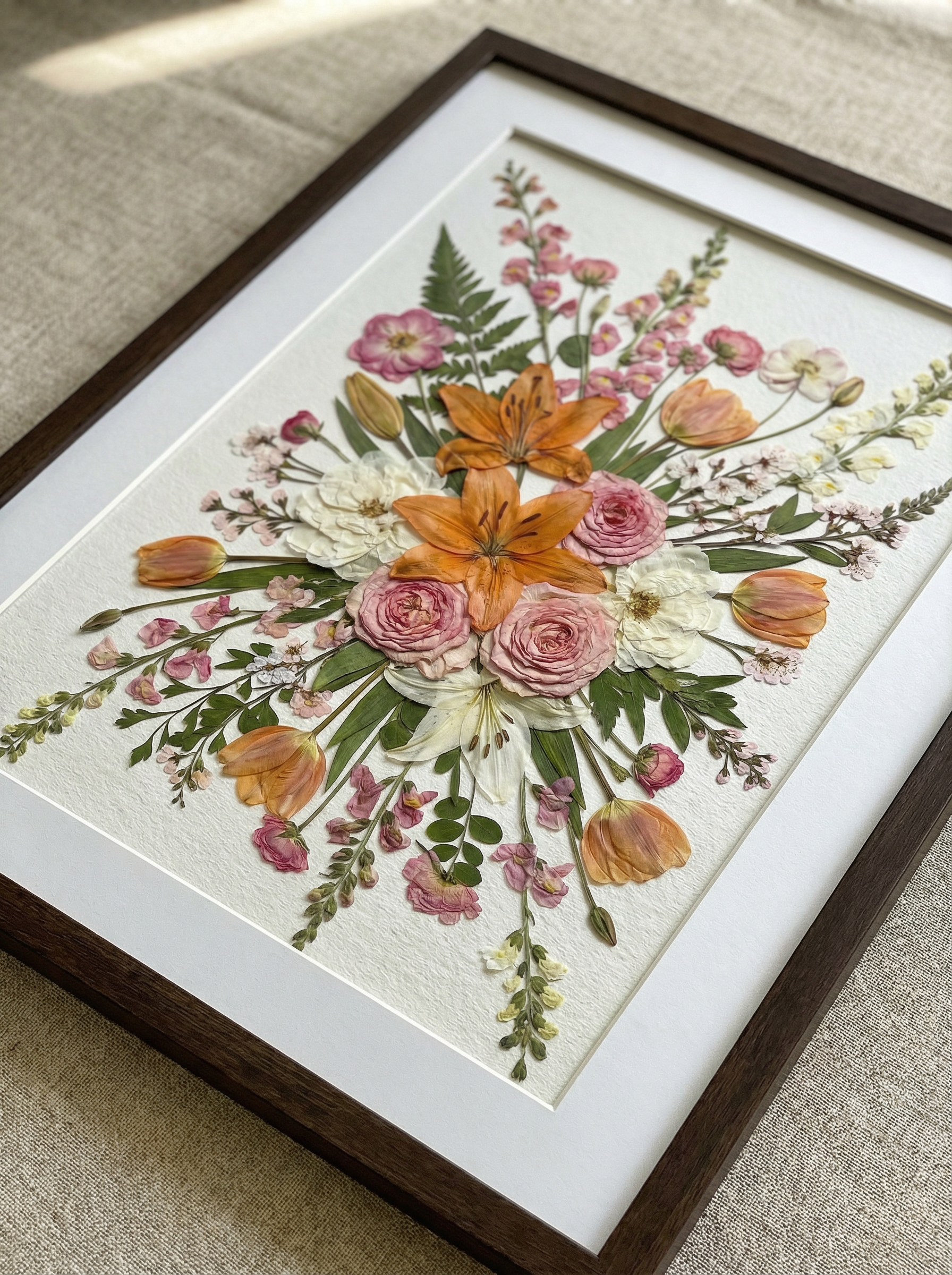 Unsere Floristin arrangiert und klebt sorgfältig getrocknete Blütenblätter auf Hintergrundpapier und kreiert so ein einzigartiges Design. Jedes Blütenblatt stammt von den schönsten saisonalen Blüten, die von unseren erfahrenen Floristen sorgfältig ausgewählt und gepresst werden.