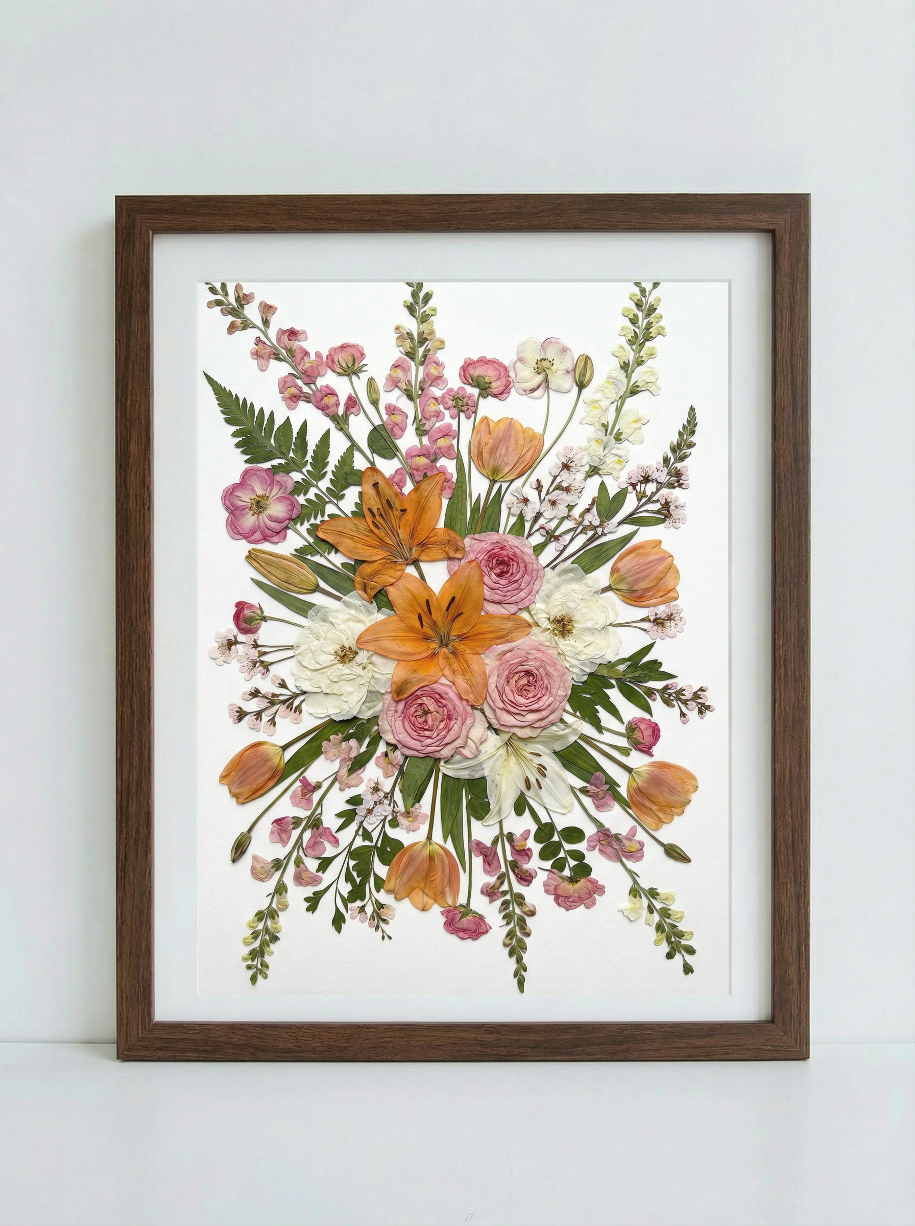 Das Kunstwerk ist mit einer transparenten Acrylplatte abgedeckt und mit einer Aluminiumrückwand versiegelt, um seine Langlebigkeit zu erhöhen und seine botanische Schönheit zu bewahren.