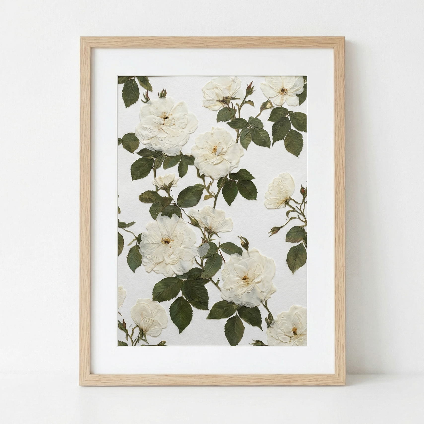 ▪ Material: Weiße Gartenrosen mit Rosenblättern und ungeöffneten Rosenknospen.
